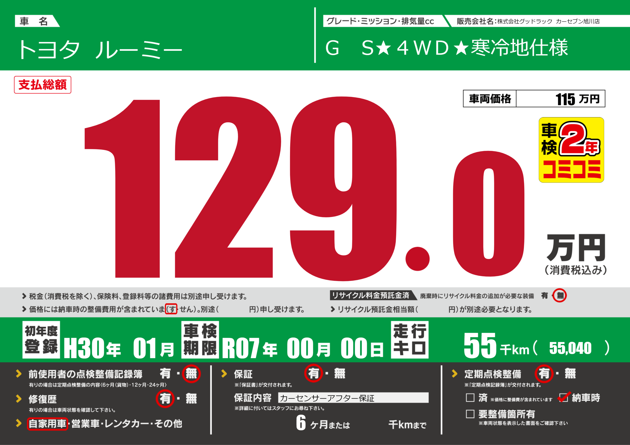 | 車名 | トヨタ ルーミー | グレード ミッション 排気量 |