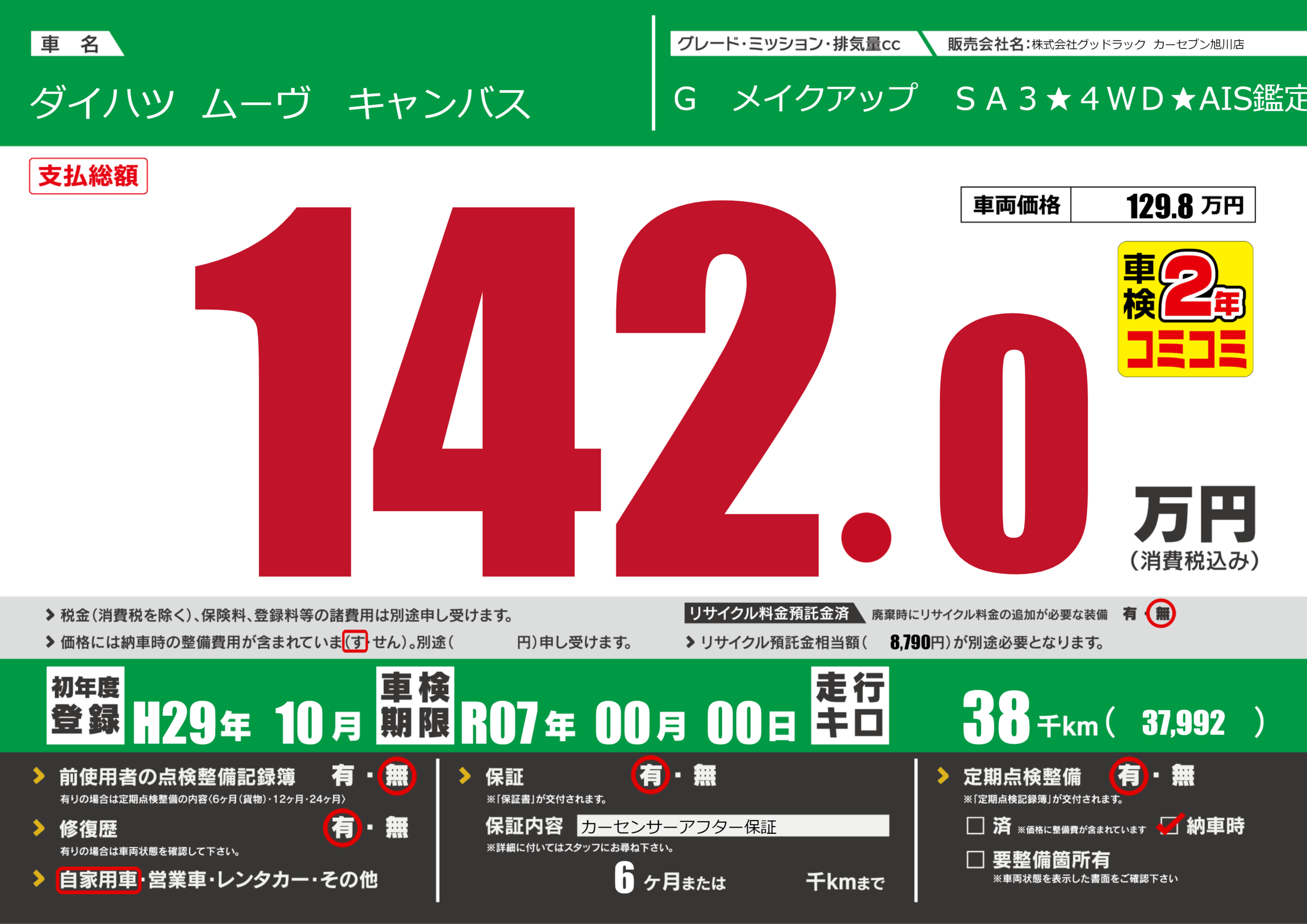 | 走行キロ | 3.8万km | 初年度登録 | H29年10月 |