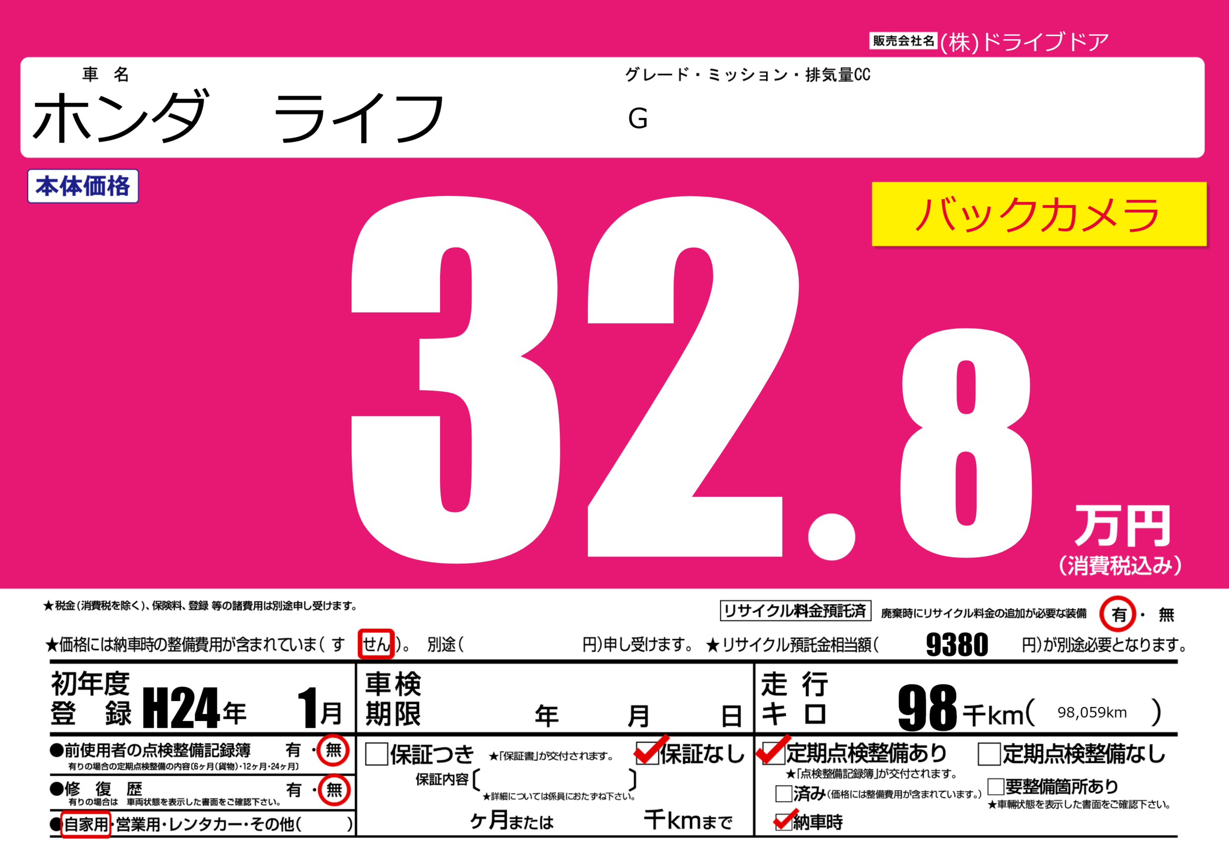 | 走行キロ | 9.8万km | 初年度登録 | H24年1月 |
