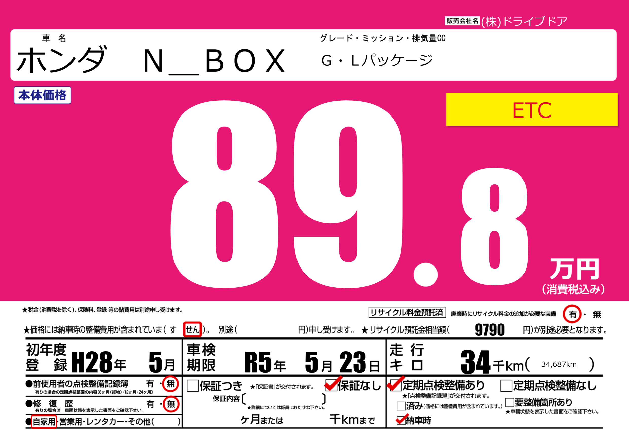 | 車名 | ホンダ N_BOX | グレード ミッション 排気量 |
