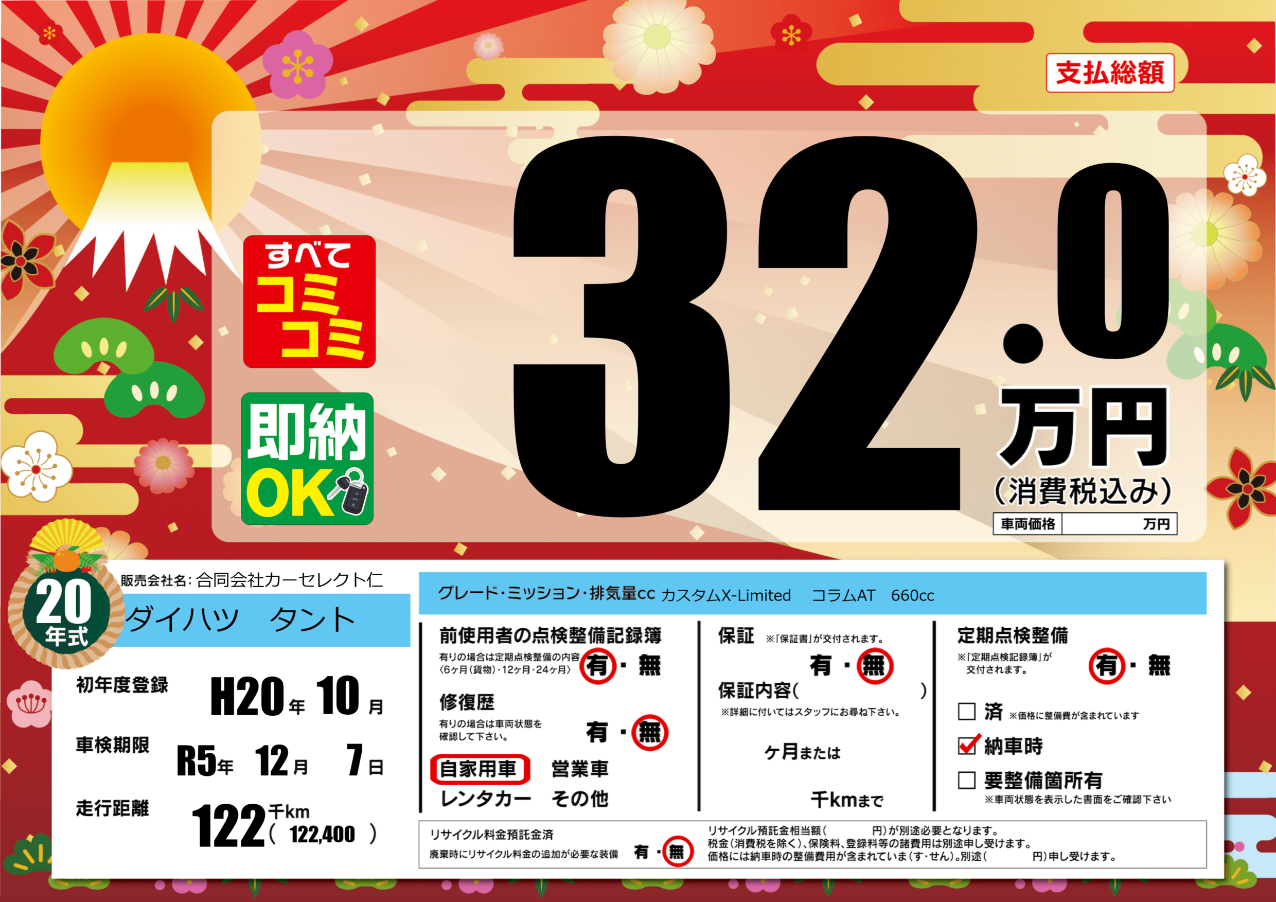 | 車名 | ダイハツ タント(売約済) | グレード ミッション 排気量 |