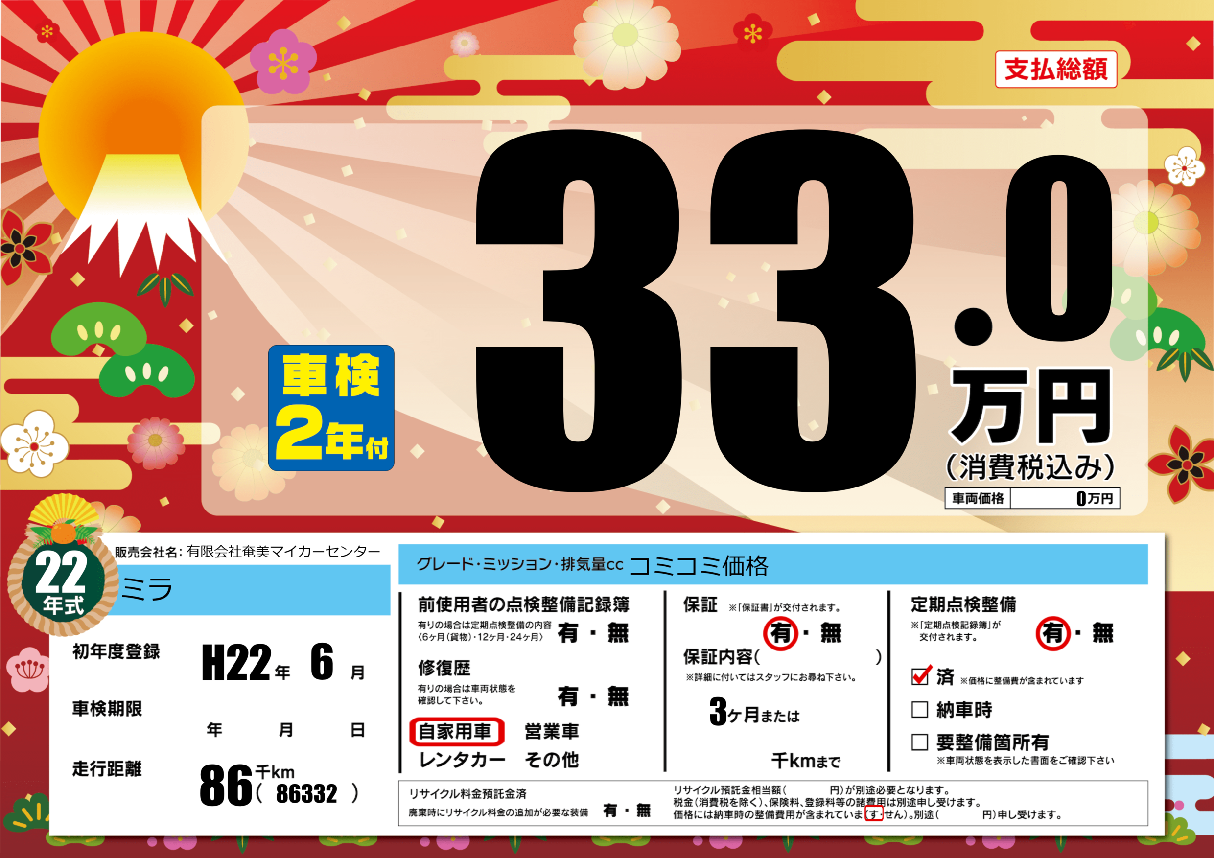 | 走行キロ | 8.6万km | 初年度登録 | H22年6月 |