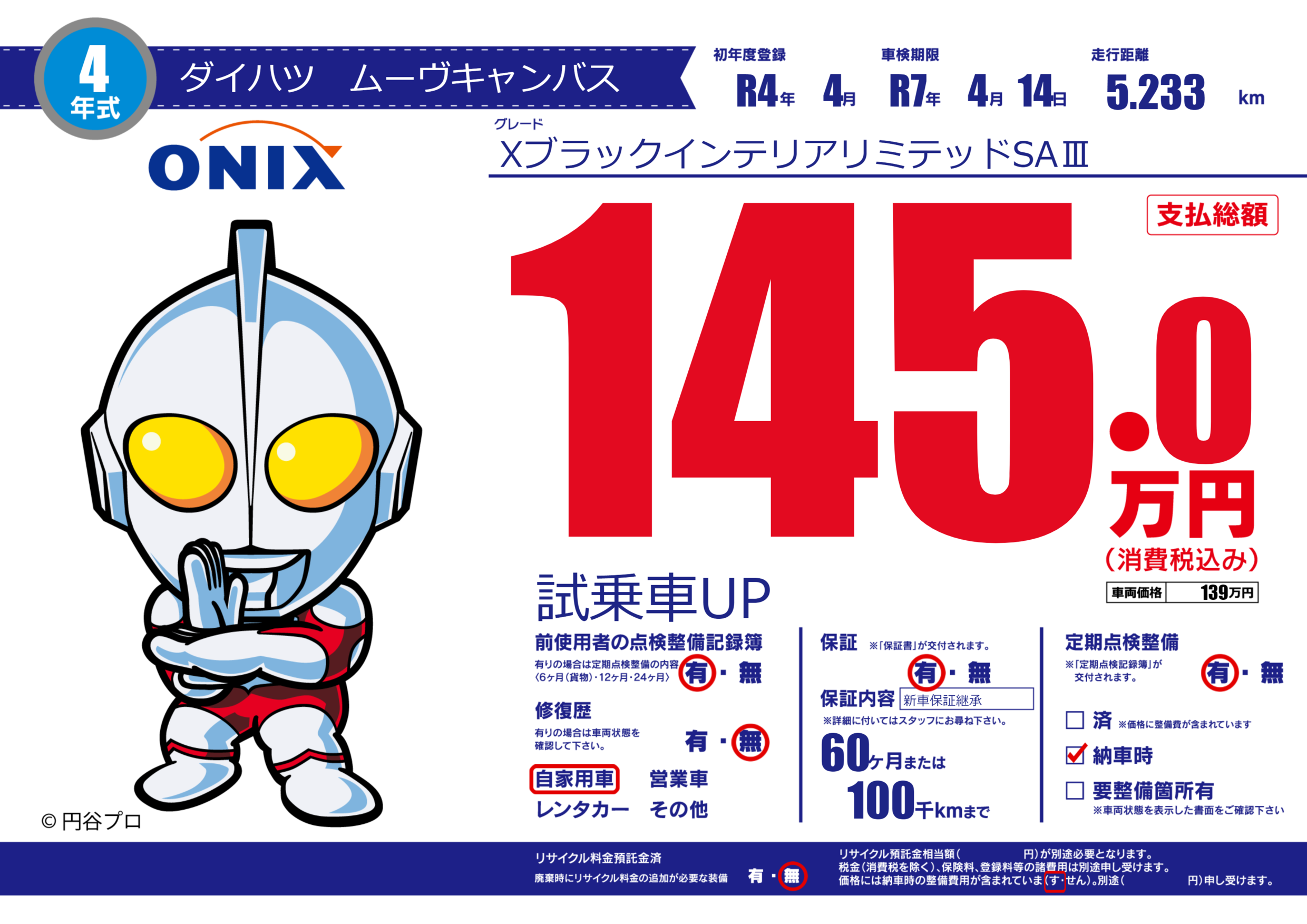 | 走行キロ | 0.5万km | 初年度登録 | R4年4月 |