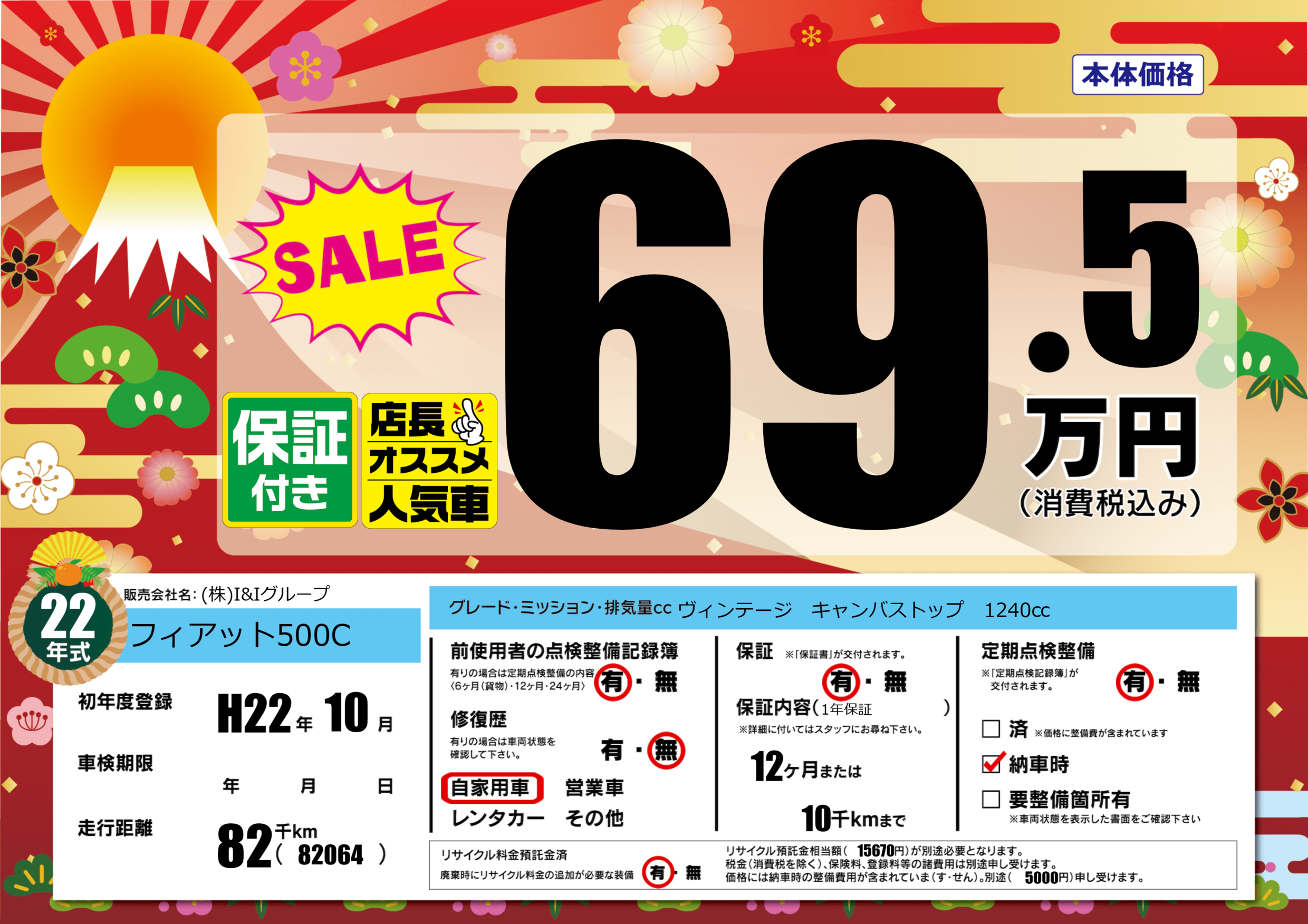 | 車名 | フィアット500C | グレード ミッション 排気量 |
