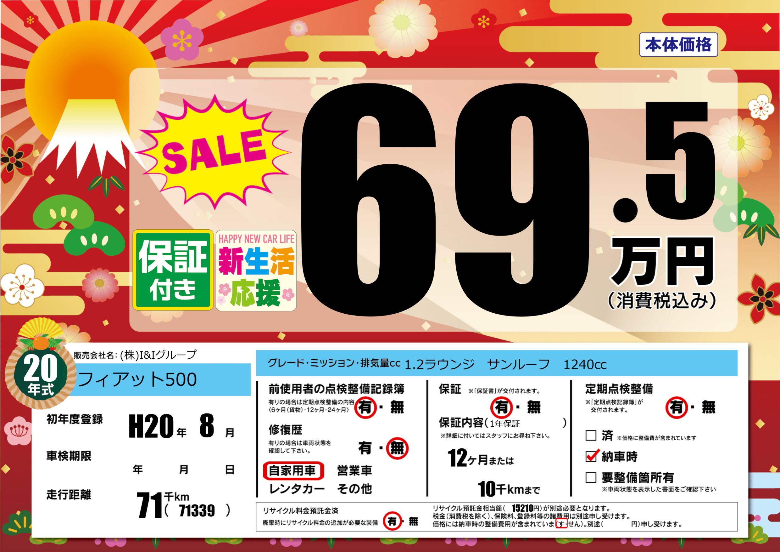 | 車名 | フィアット500 | グレード ミッション 排気量 |