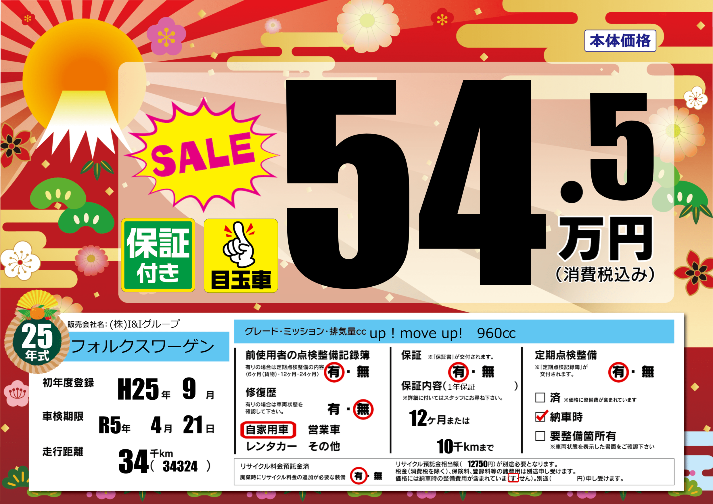 | 走行キロ | 3.4万km | 初年度登録 | H25年9月 |