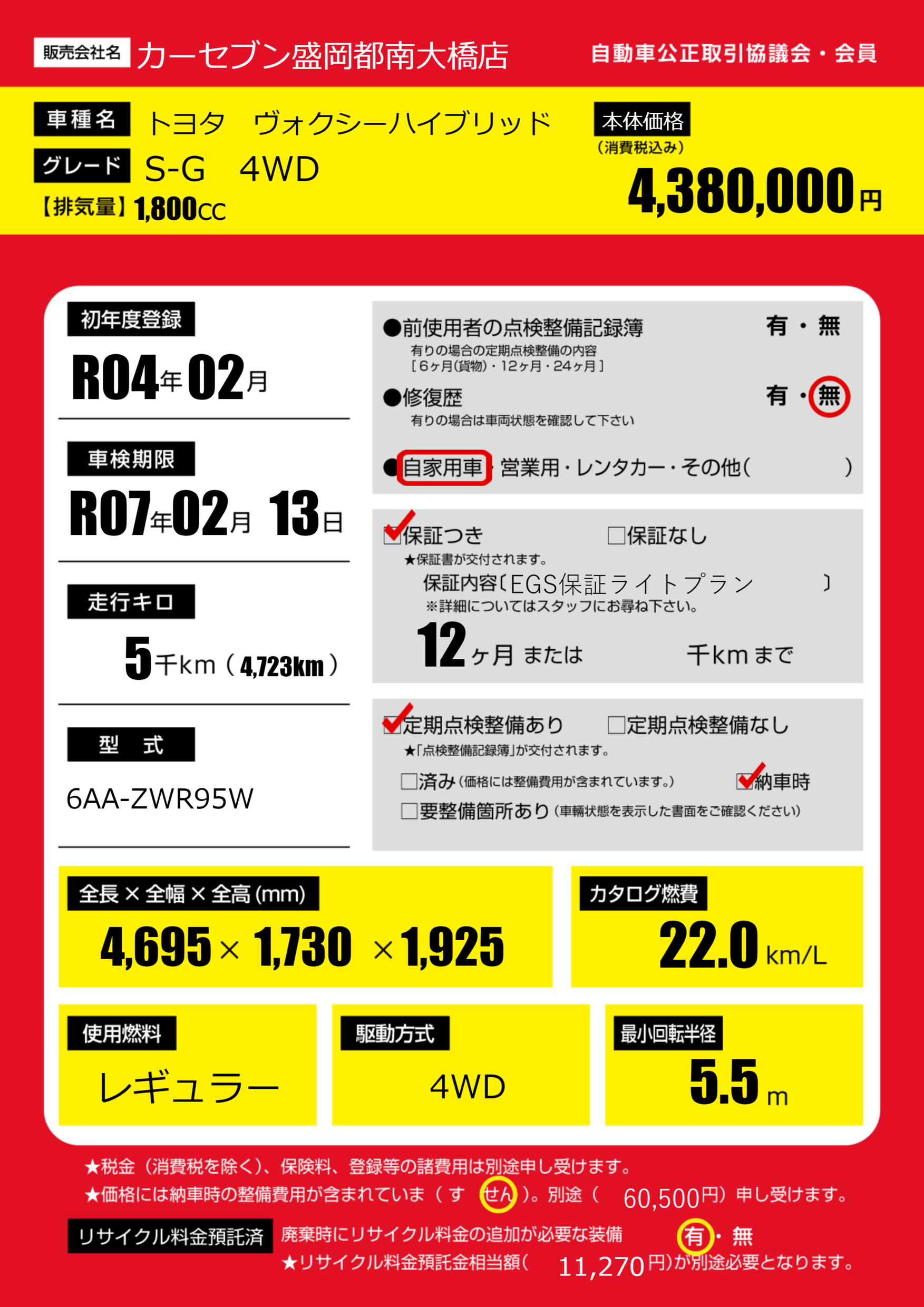 | 車名 | トヨタ ヴォクシーハイブリッド | グレード ミッション 排気量 |