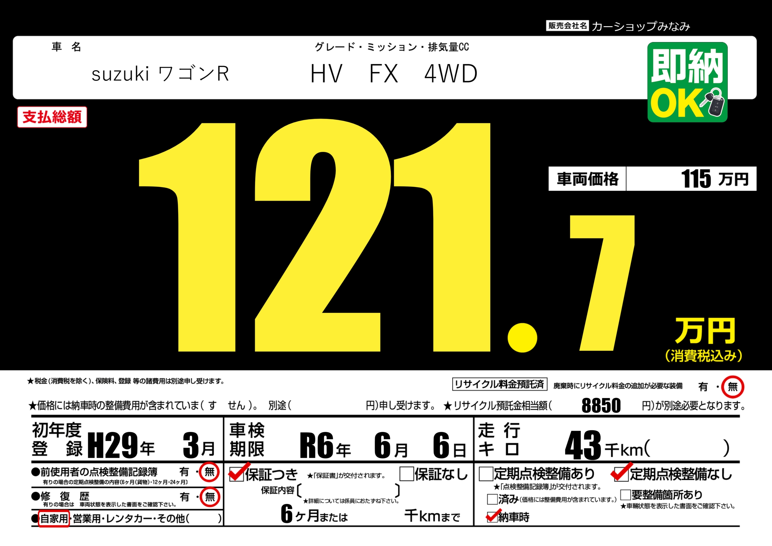 | 車検制限 | R6年 6月 6日 | ||