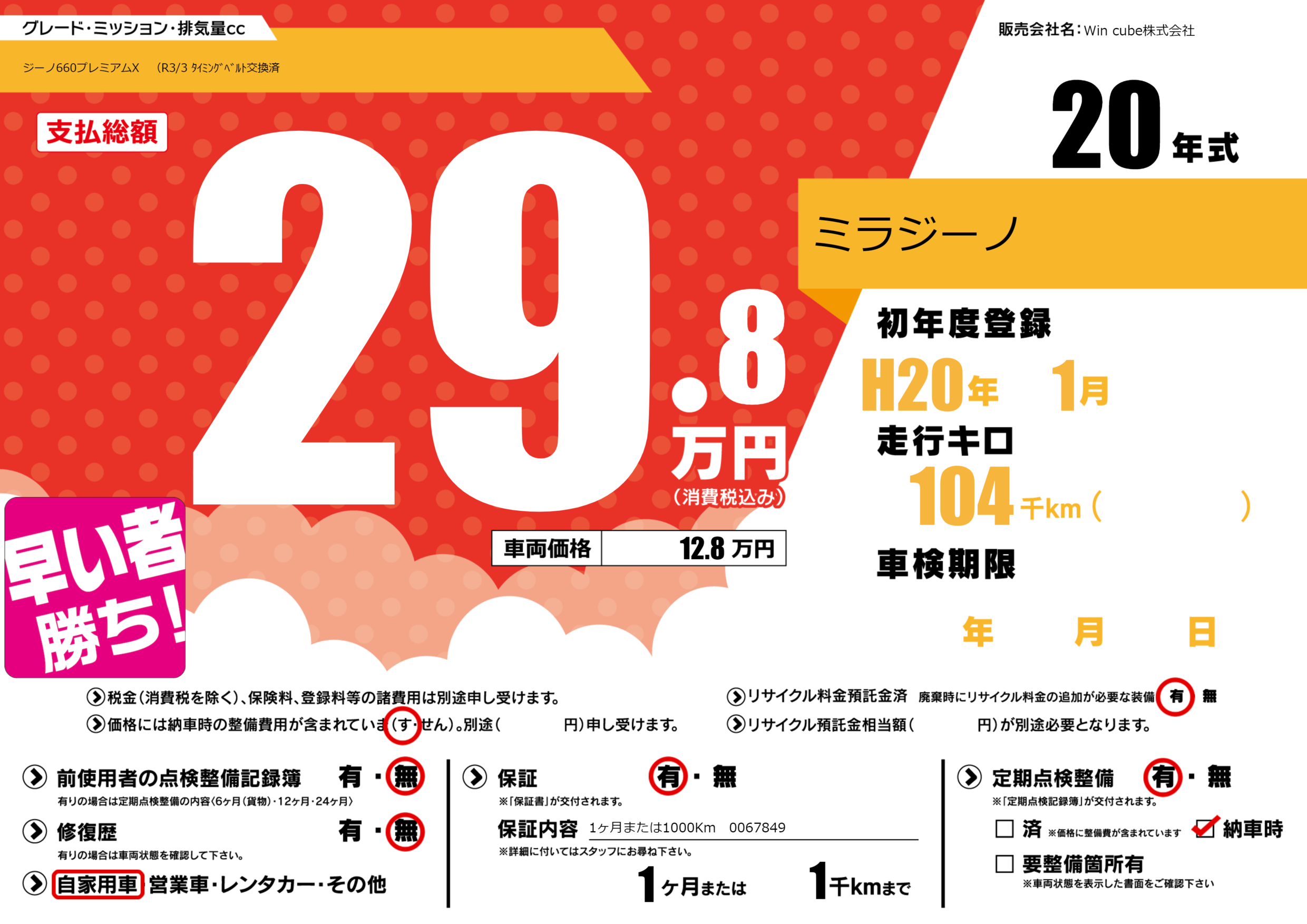 保証付き 保証内容(1ヶ月または1000Km 0067849) 1ヶ月または1千km |