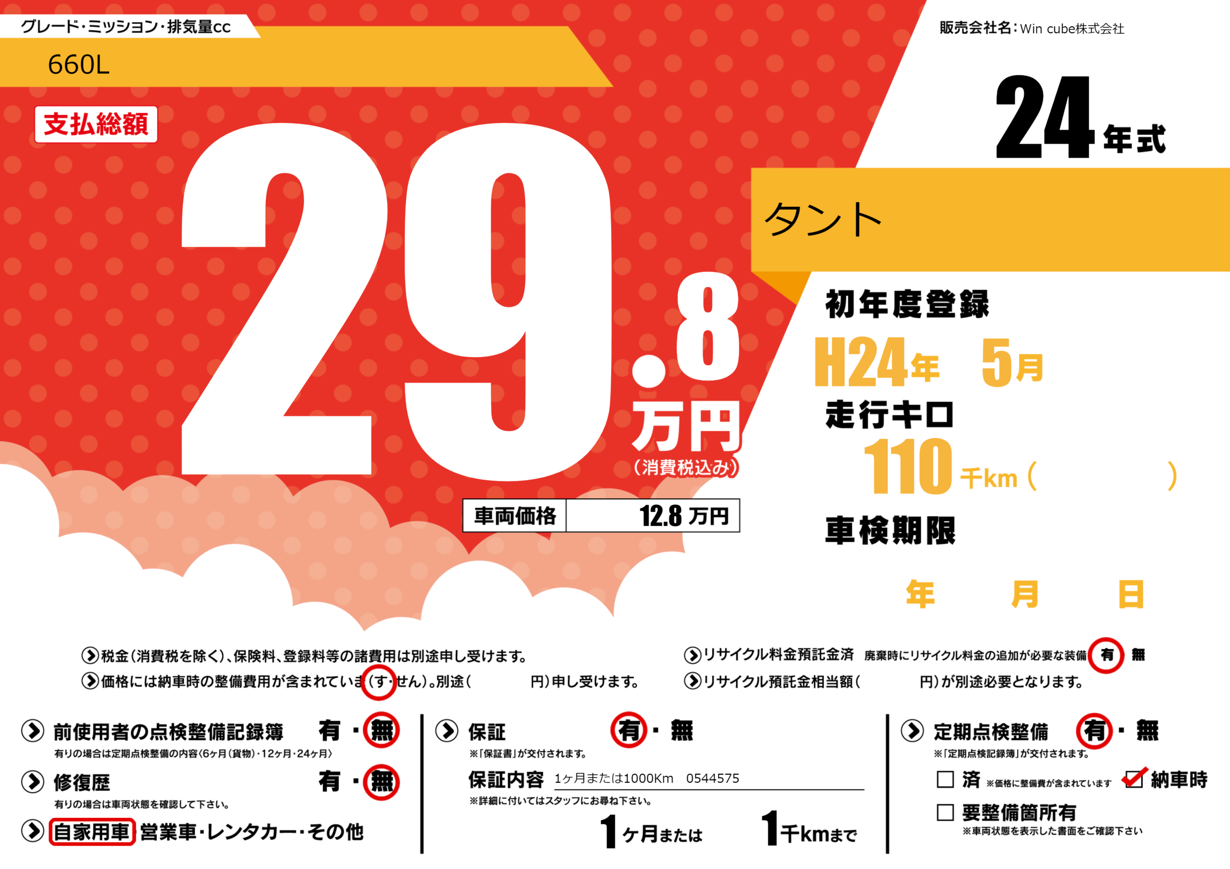 | 定期点検整備 | 定期点検整備あり 納車時あり | ||
