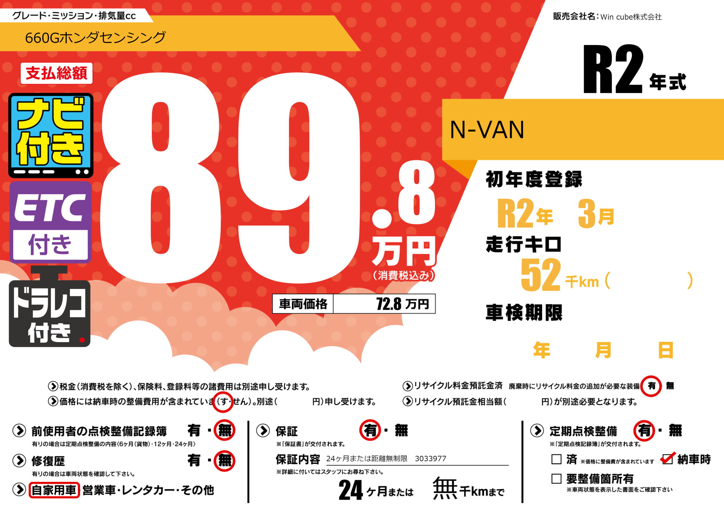 | 車名 | N-VAN | グレード ミッション 排気量 |