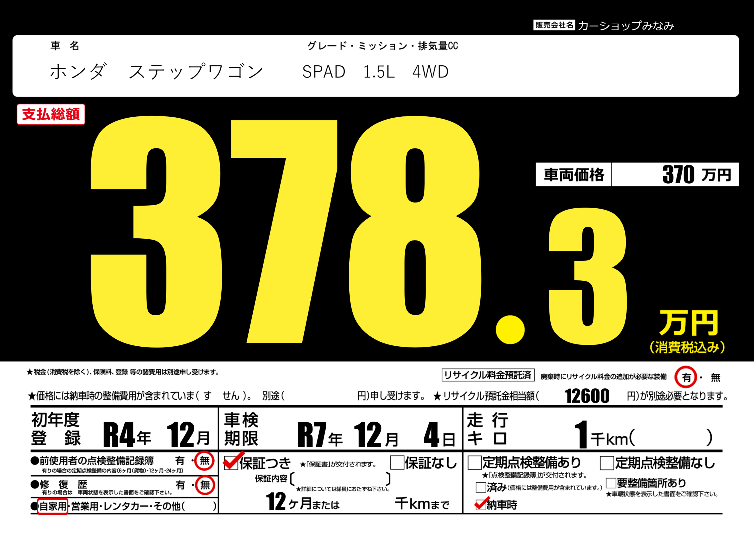 | 走行キロ | 0.1万km | 初年度登録 | R4年12月 |