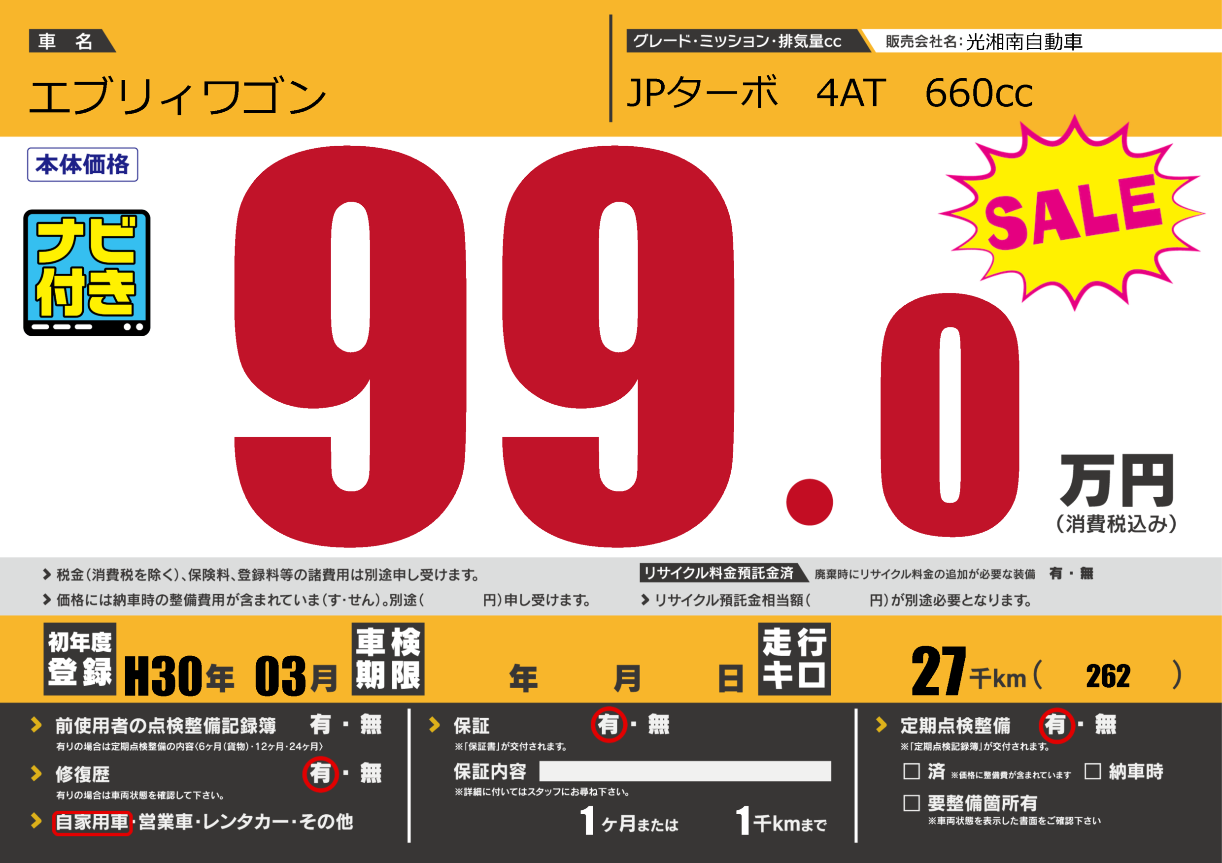 | 車名 | エブリィワゴン | グレード ミッション 排気量 |
