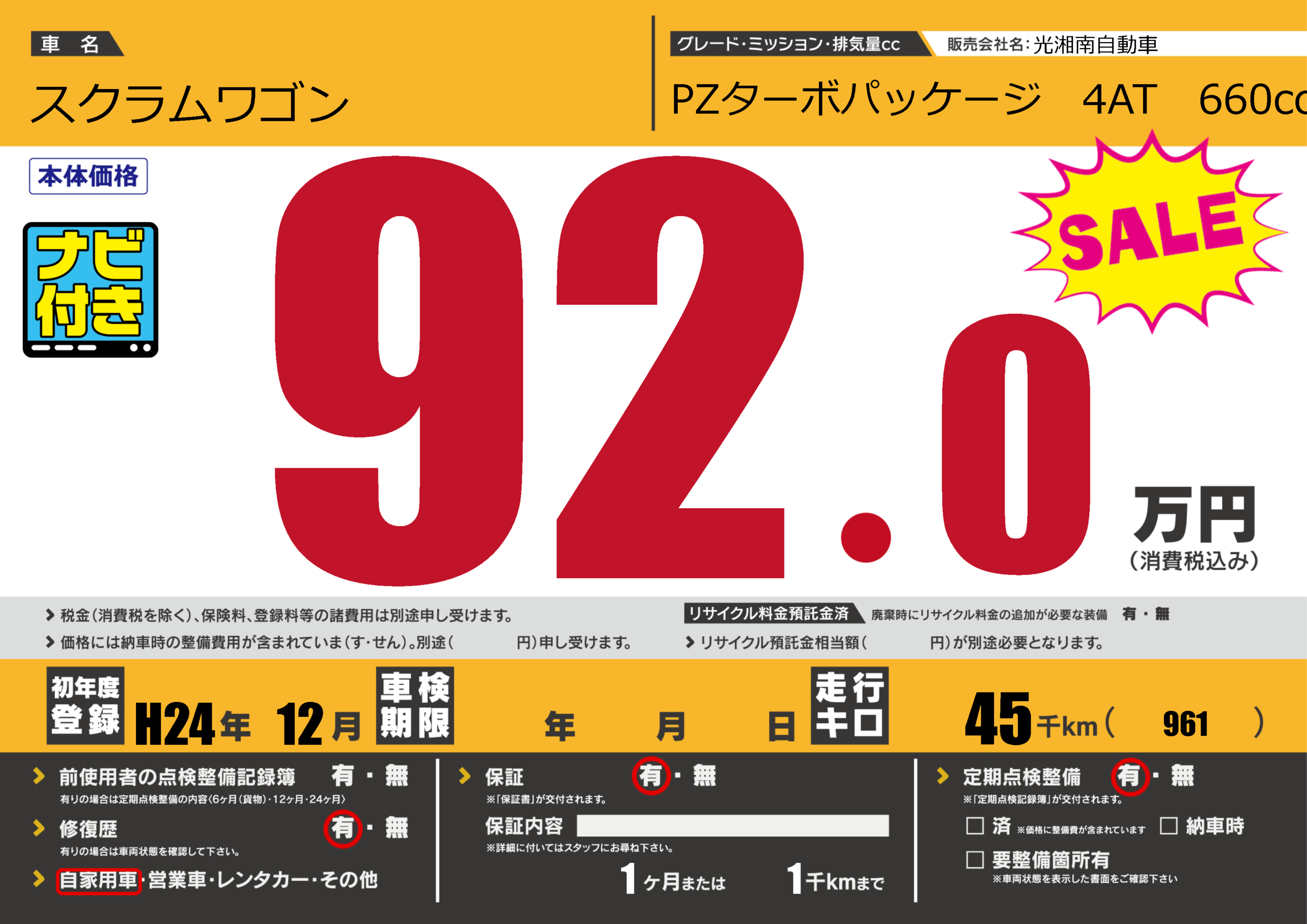 | 走行キロ | 4.5万km | 初年度登録 | H24年12月 |