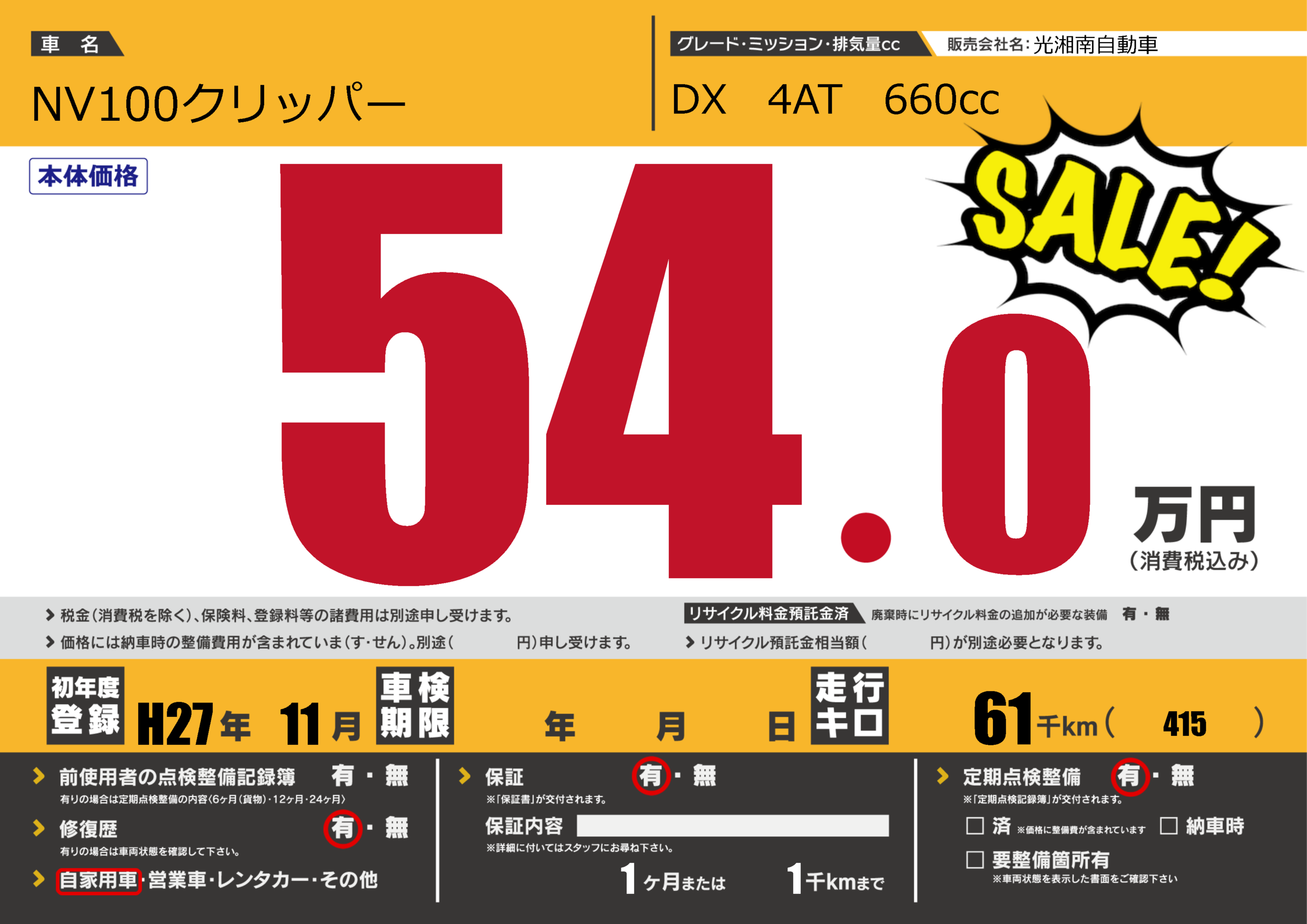 | 車名 | NV100クリッパー | グレード ミッション 排気量 |