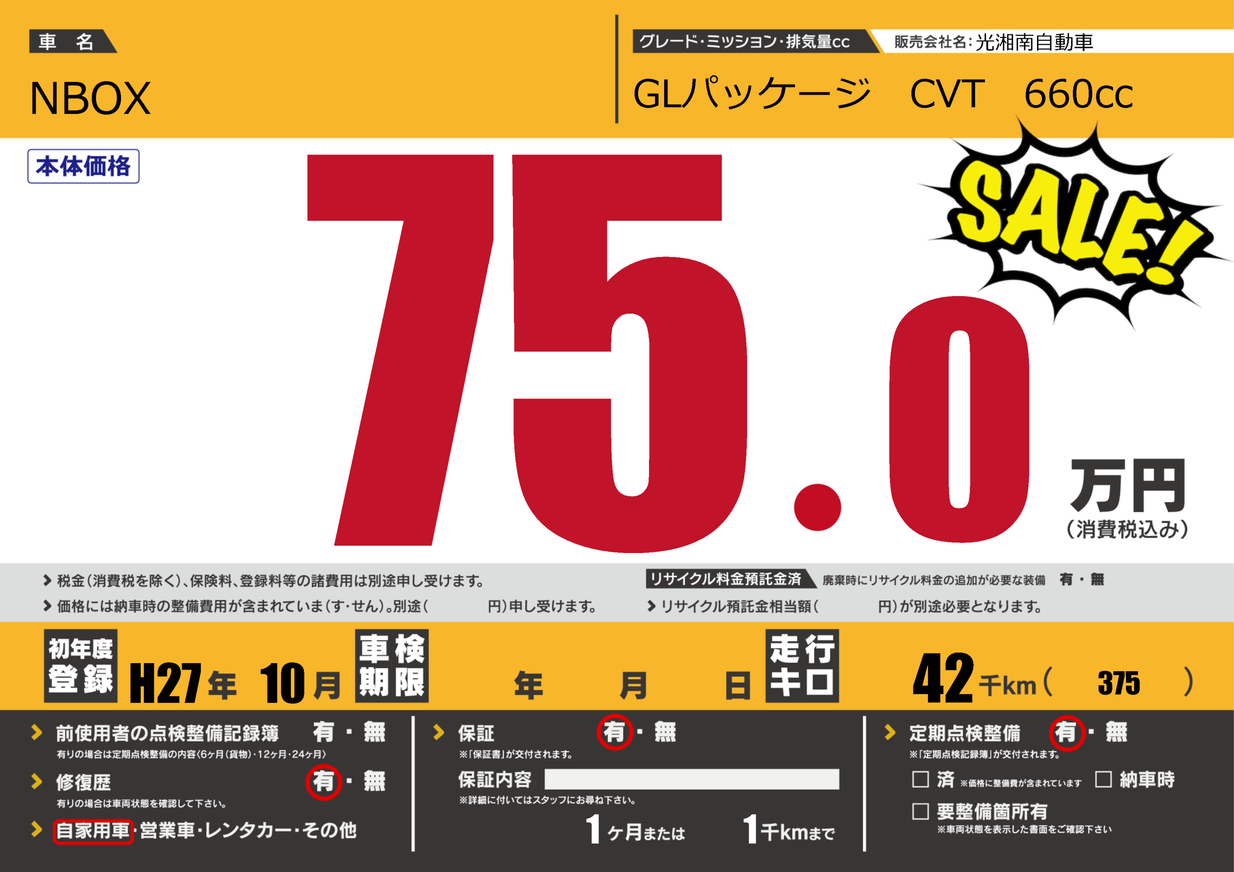 | 車名 | NBOX | グレード ミッション 排気量 |