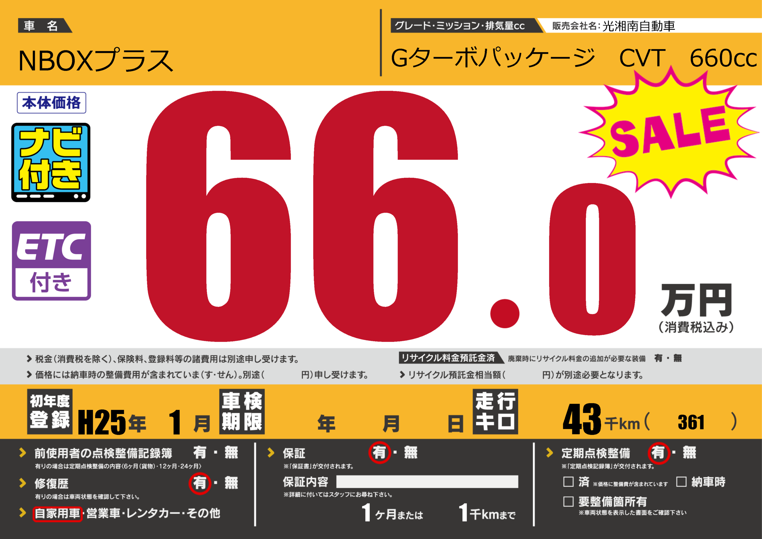| 車名 | NBOXプラス | グレード ミッション 排気量 |