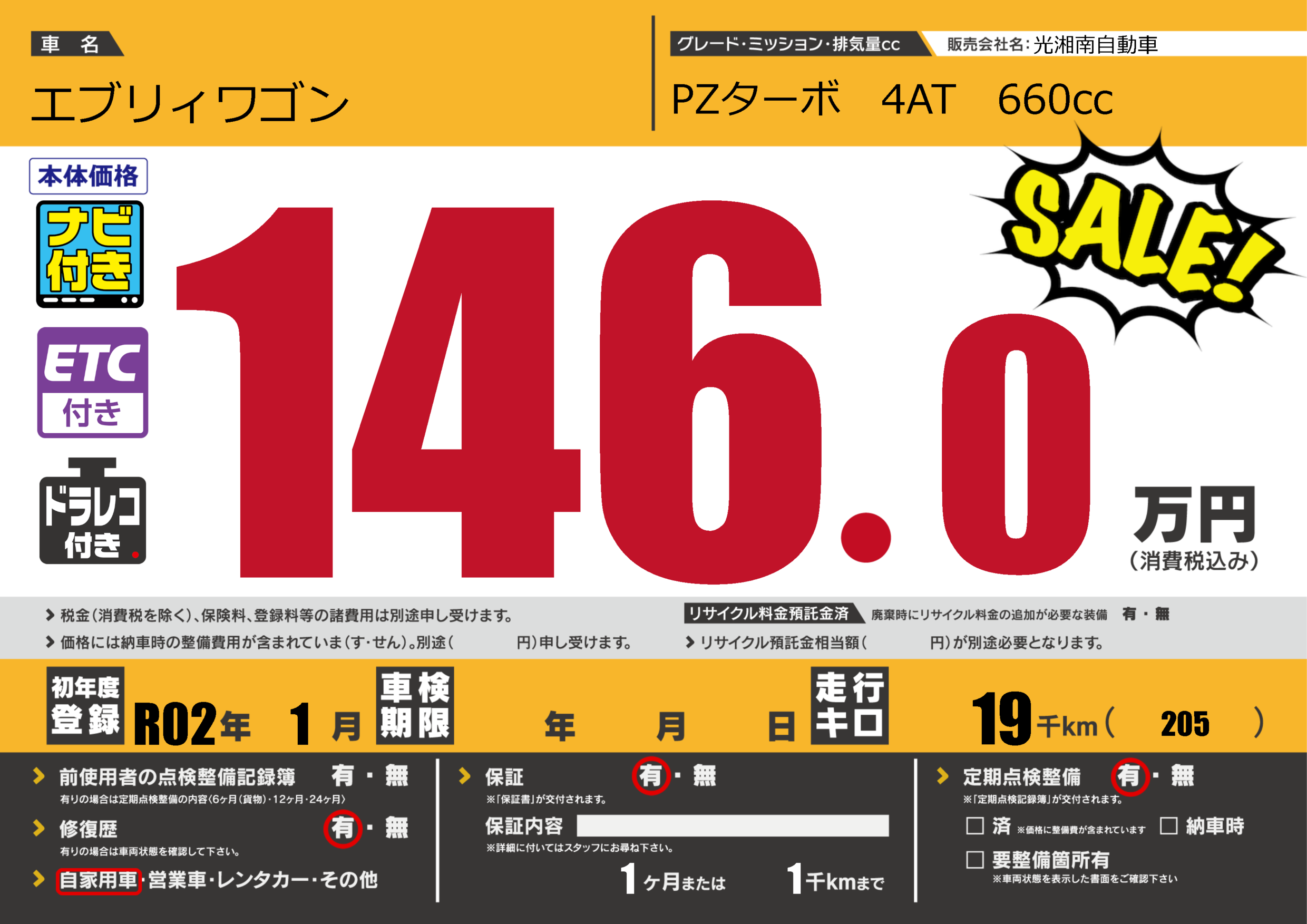 | 車名 | エブリィワゴン | グレード ミッション 排気量 |