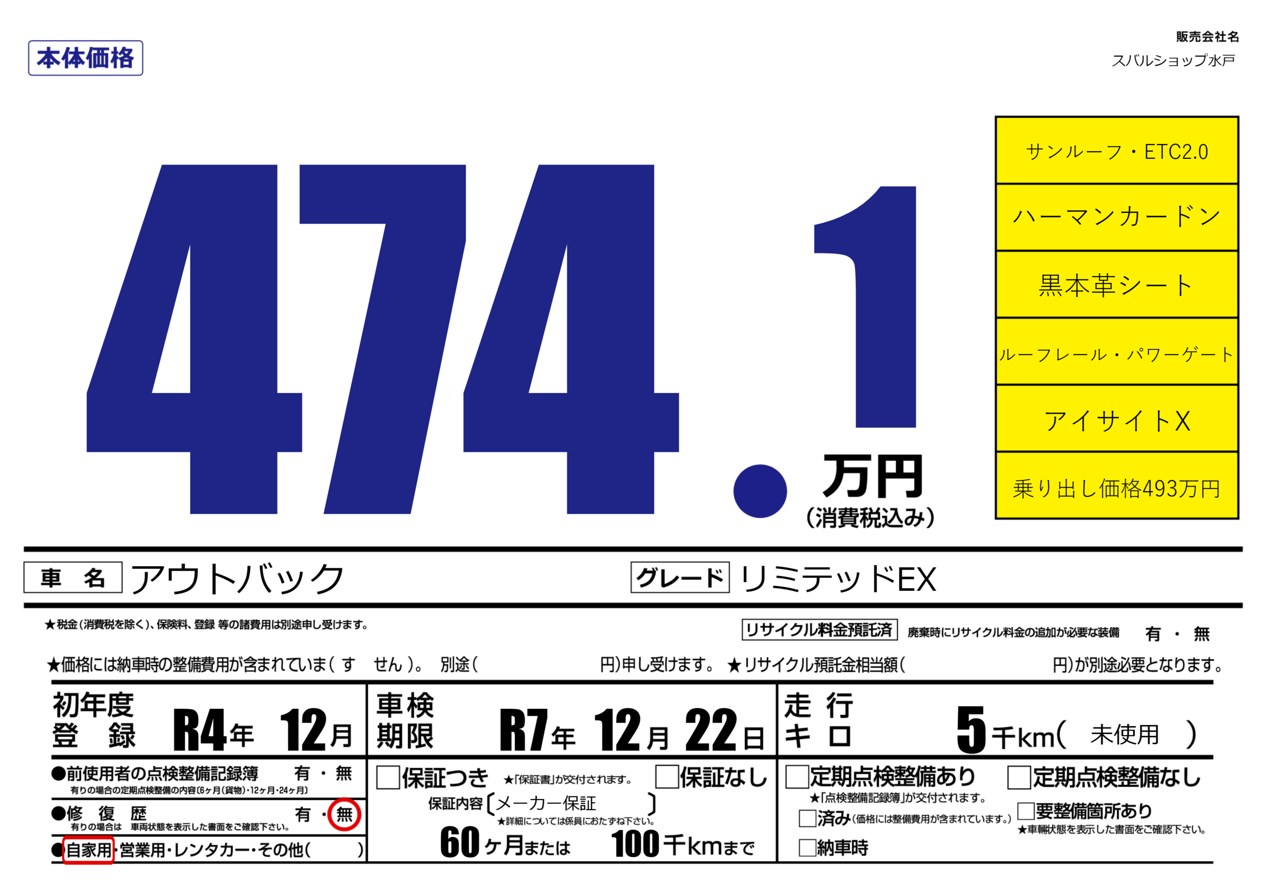 | 車名 | アウトバック | グレード ミッション 排気量 |