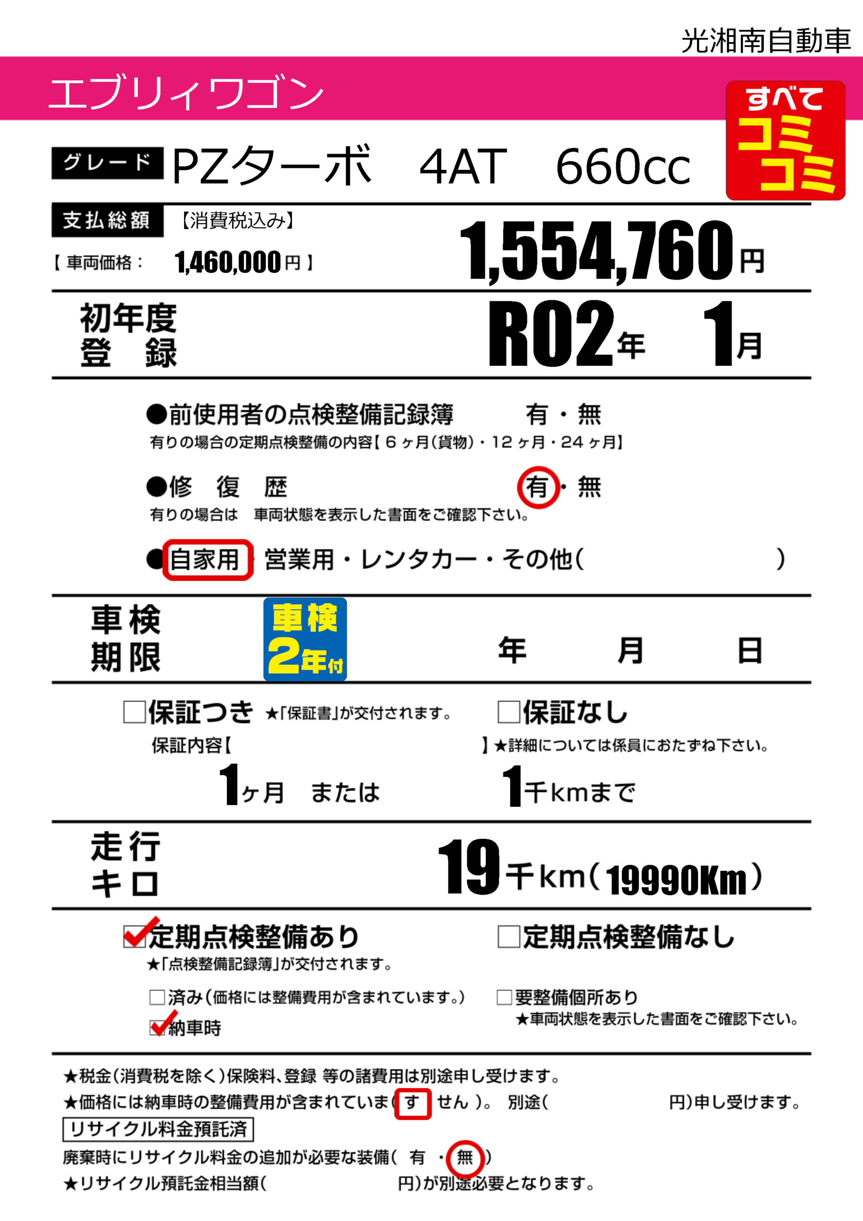 | 車名 | エブリィワゴン | グレード ミッション 排気量 |