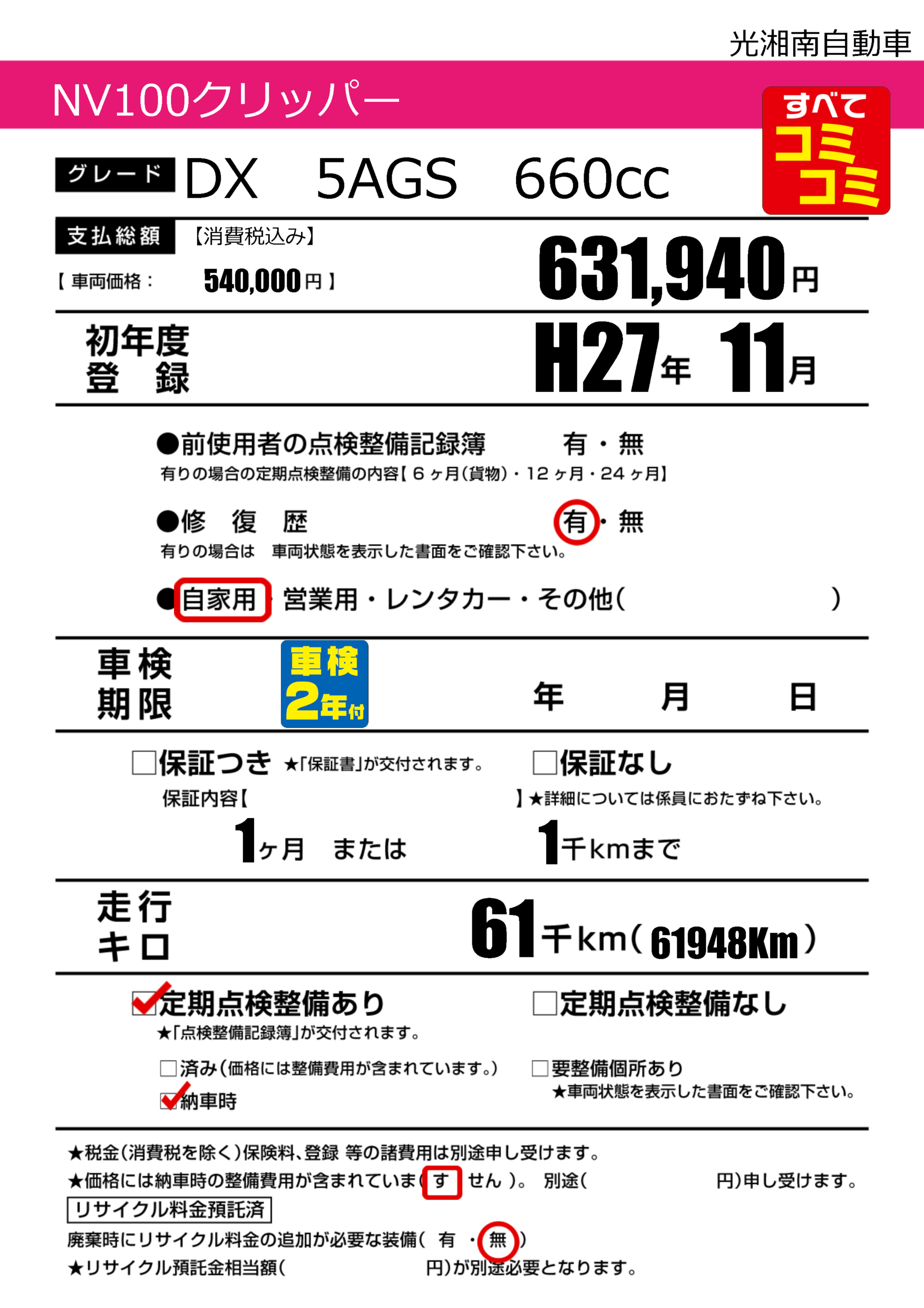 | 定期点検整備 | 定期点検整備あり 納車時あり | ||