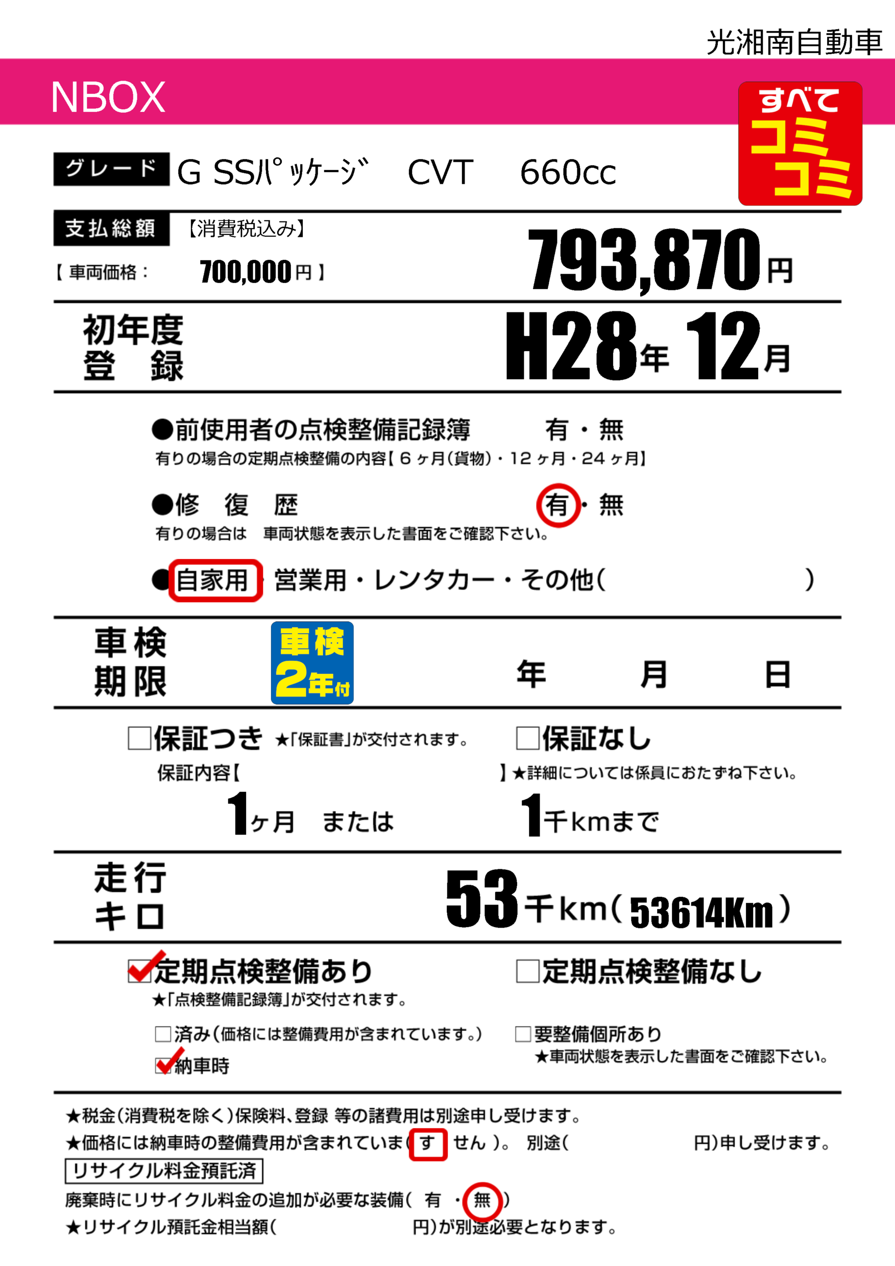 | 車名 | NBOX | グレード ミッション 排気量 |
