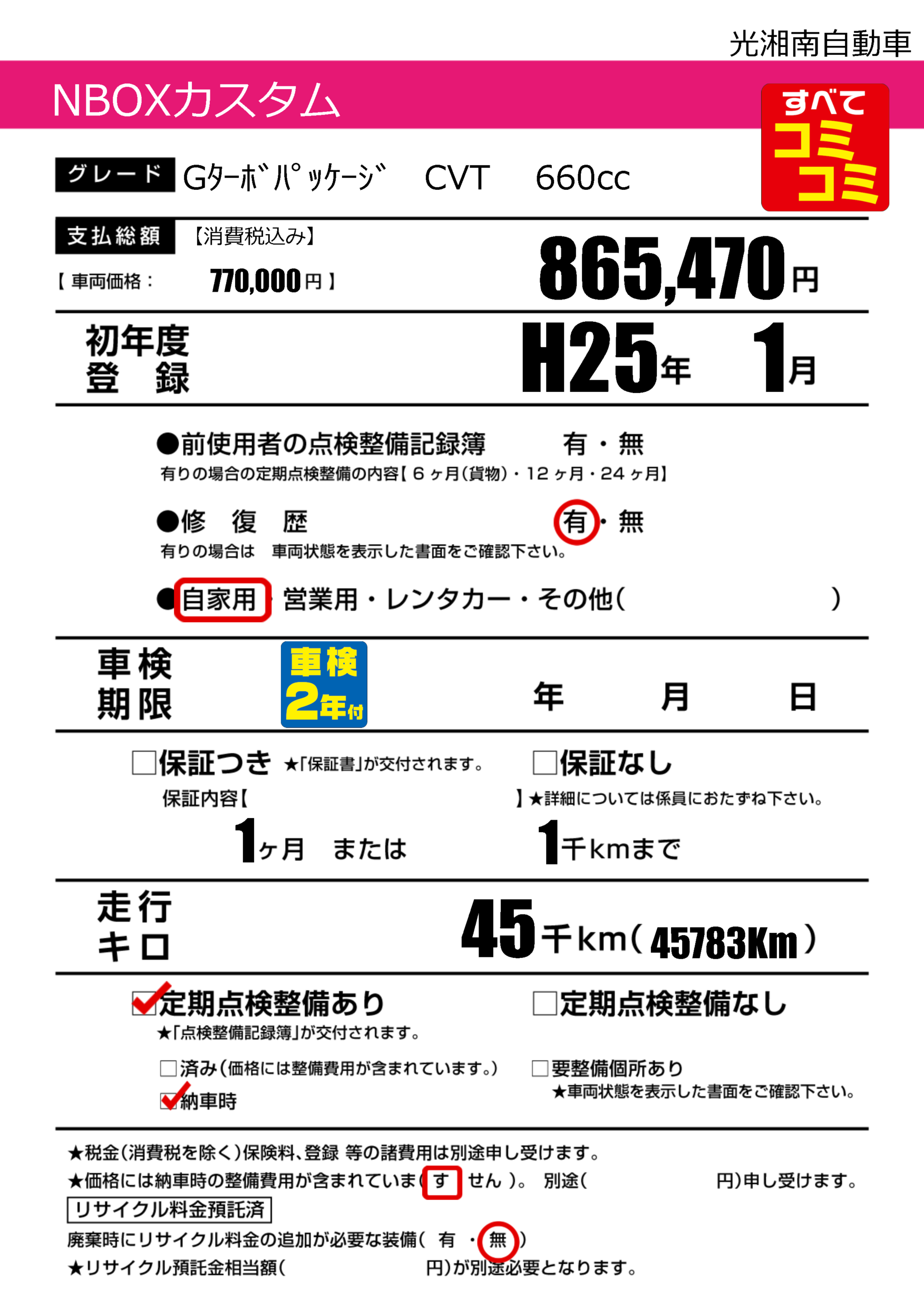| 車名 | NBOXカスタム | グレード ミッション 排気量 |