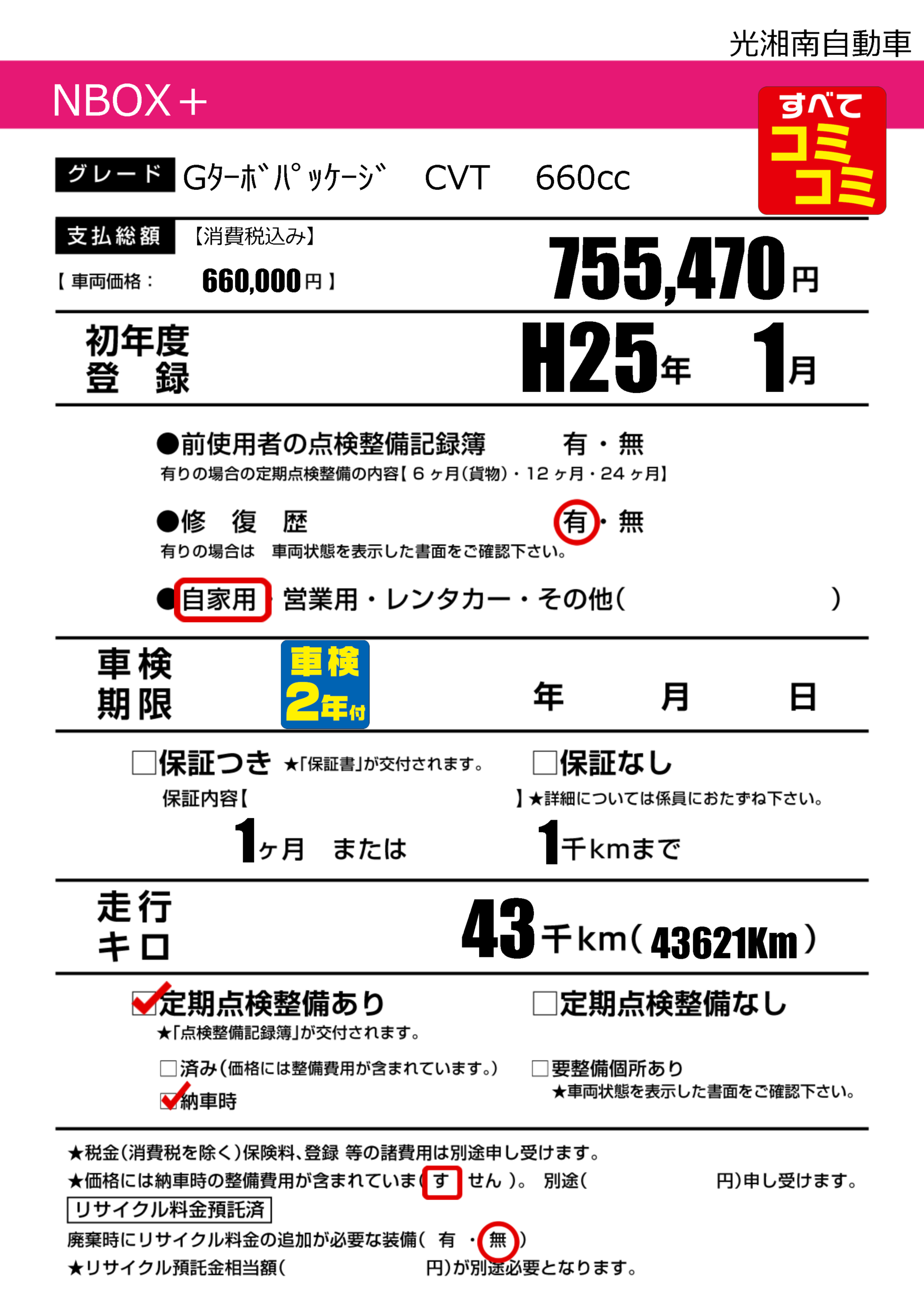 | 車名 | NBOX+ | グレード ミッション 排気量 |
