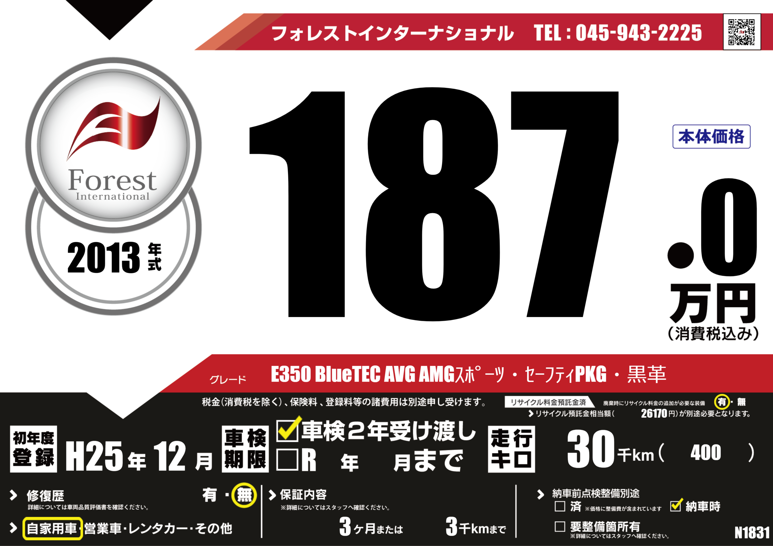 | 走行キロ | 3万km | 初年度登録 | H25年12月 |