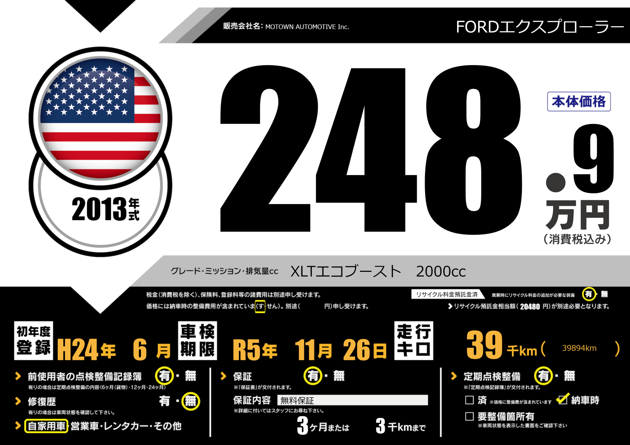 | 車名 | FORDエクスプローラー | グレード ミッション 排気量 |