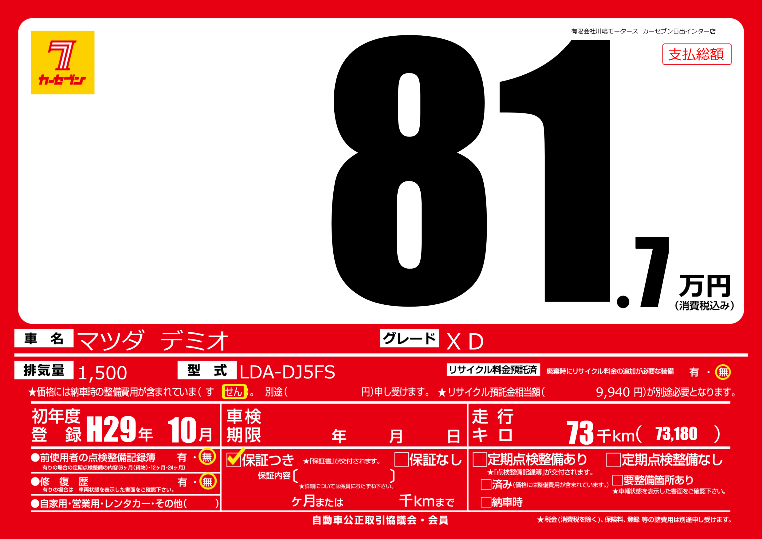 | 車名 | マツダ デミオ | グレード ミッション 排気量 |