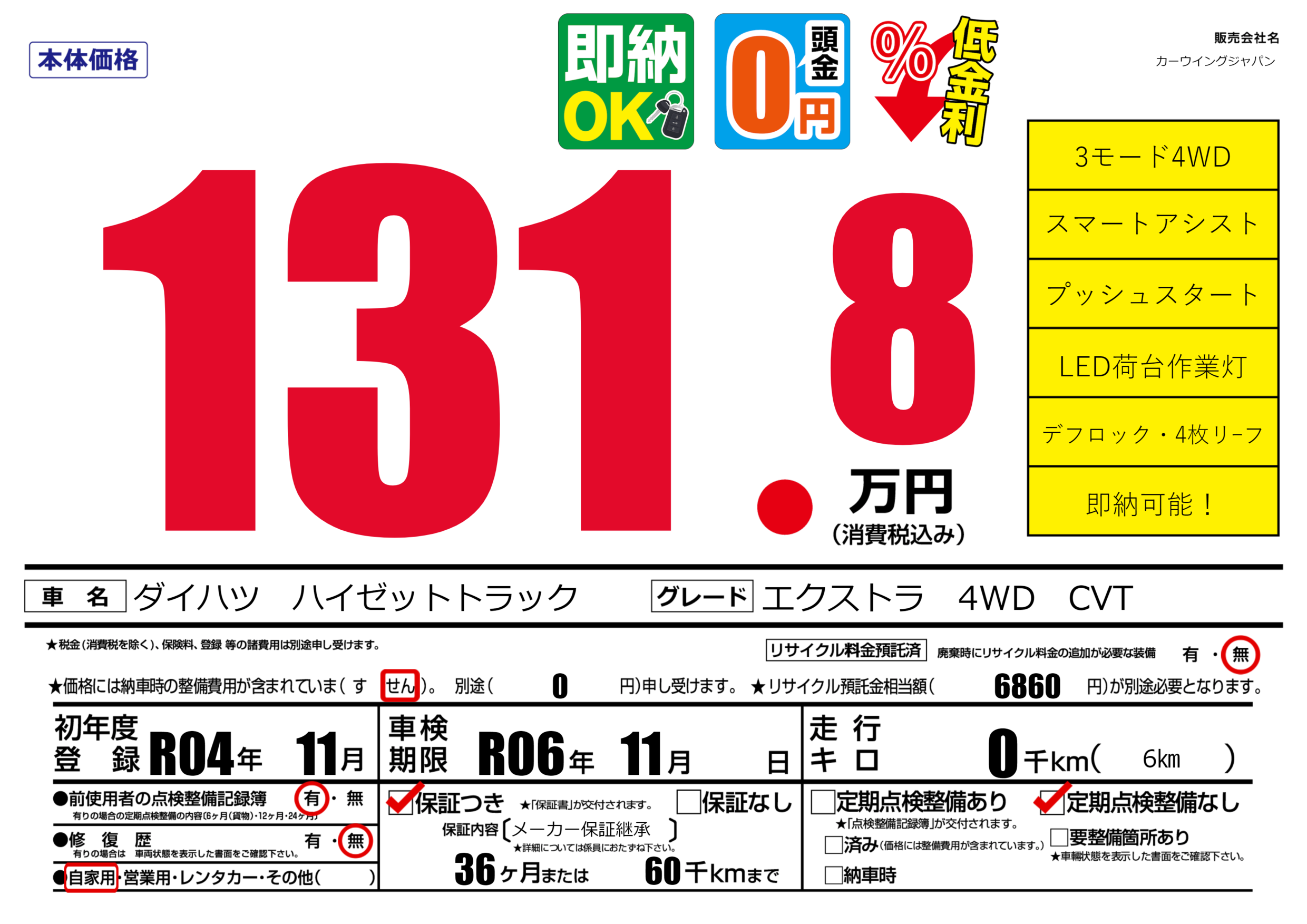| 車名 | ダイハツ ハイゼットトラック | グレード ミッション 排気量 |