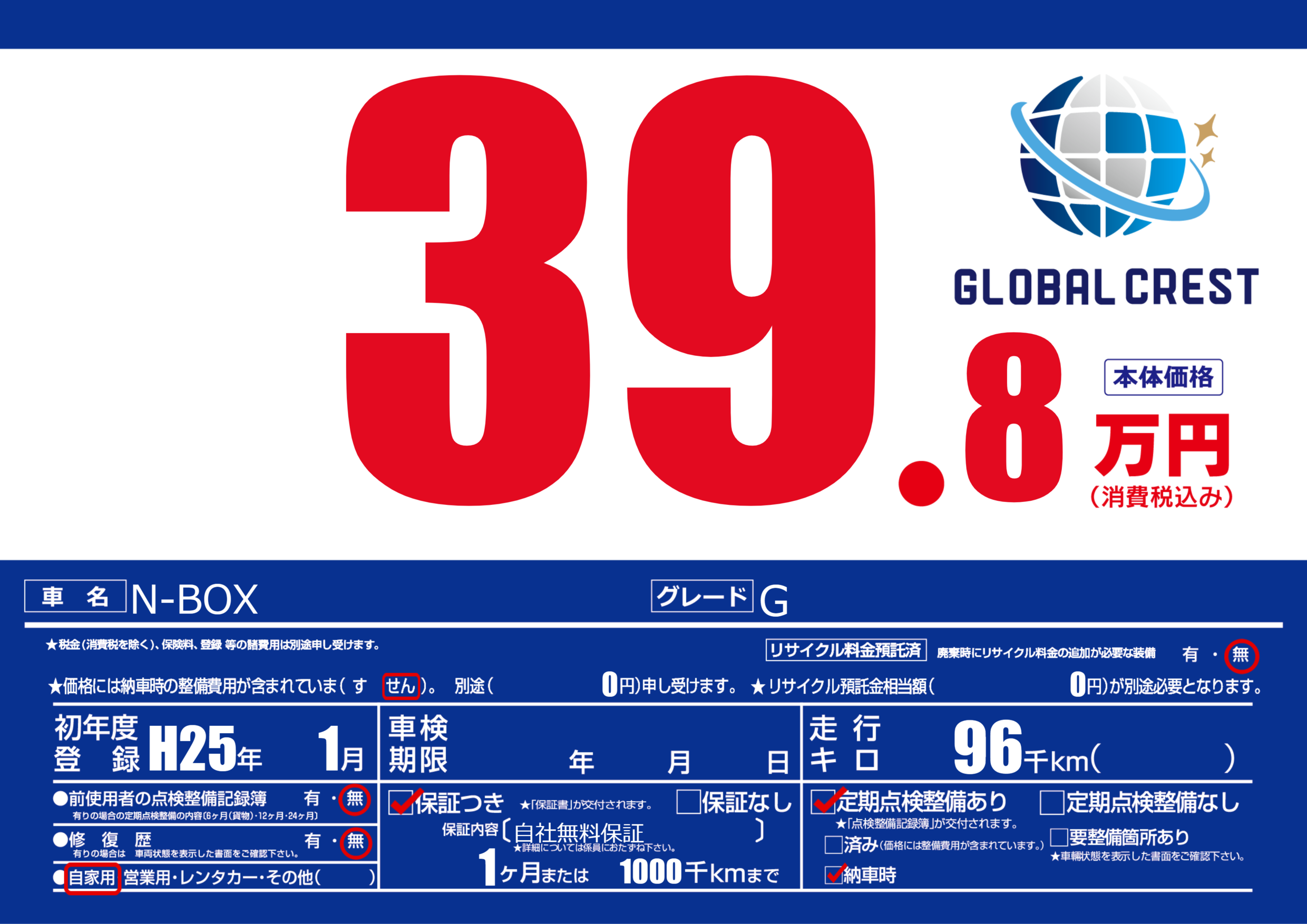 | 定期点検整備 | 定期点検整備あり 納車時あり | ||
