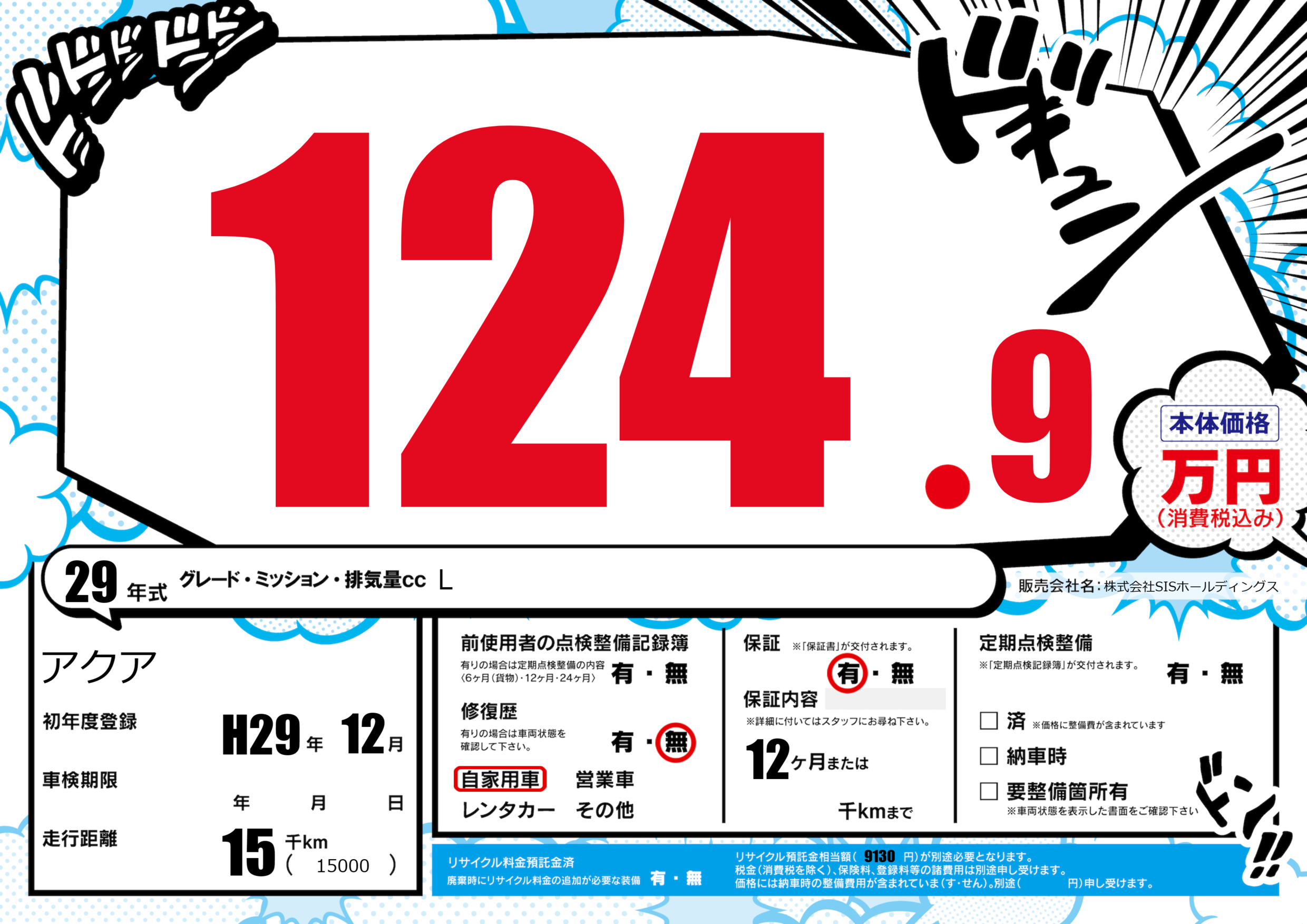 | 走行キロ | 1.5万km | 初年度登録 | H29年12月 |