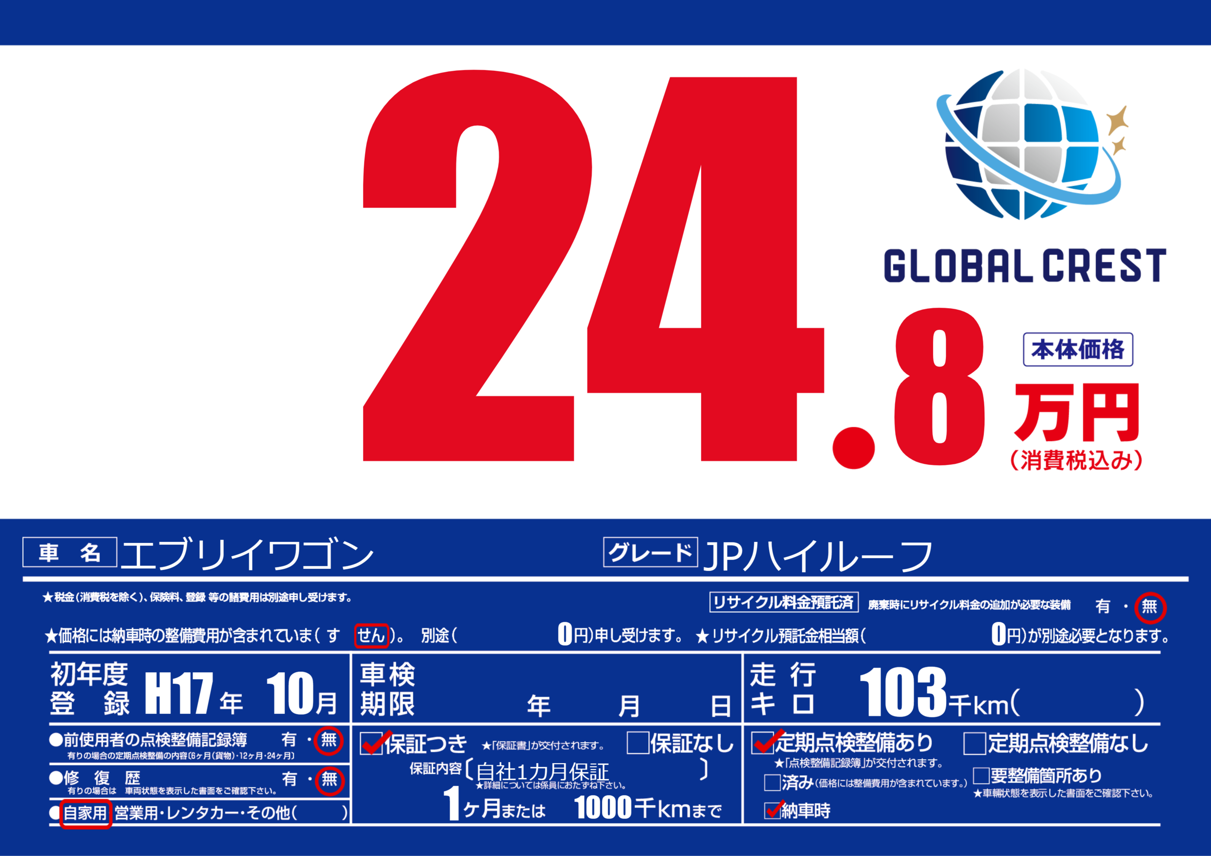 | 走行キロ | 10.3万km | 初年度登録 | H17年10月 |