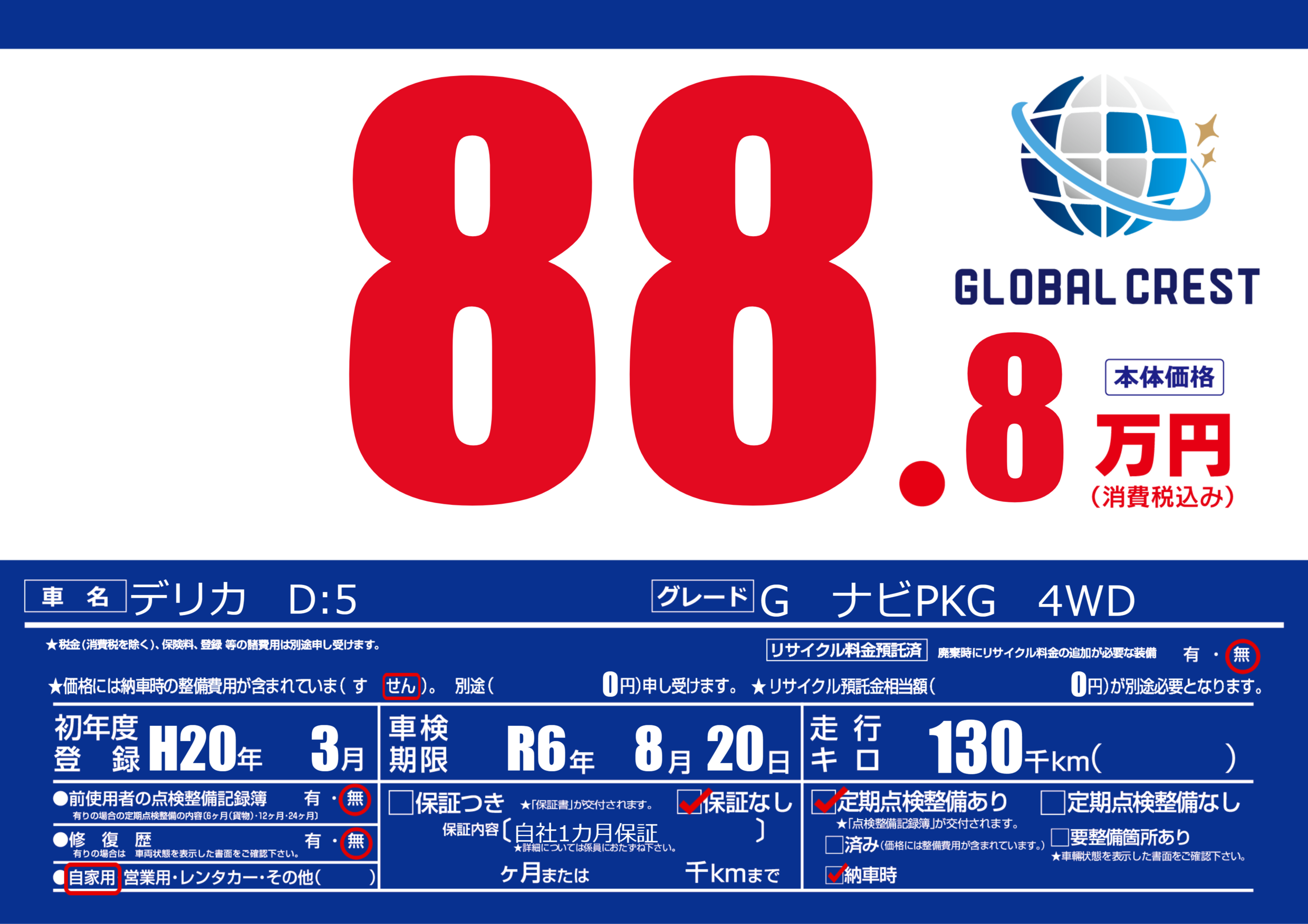 | 車名 | デリカ D:5 | グレード ミッション 排気量 |