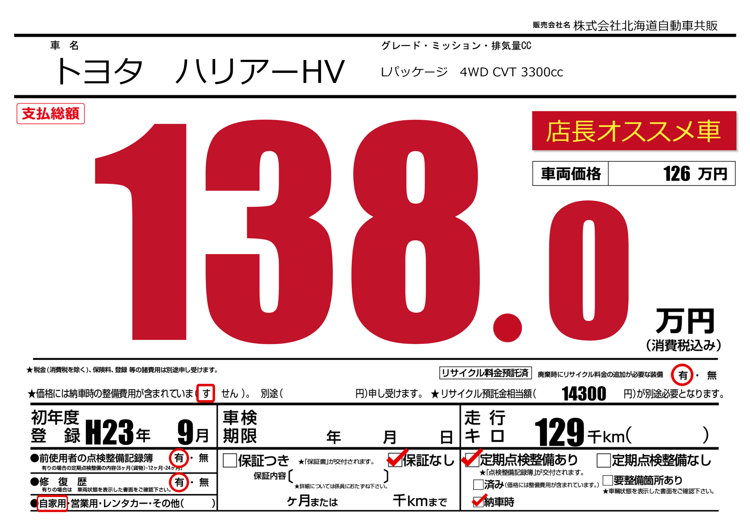 | 走行キロ | 12.9万km | 初年度登録 | H23年9月 |