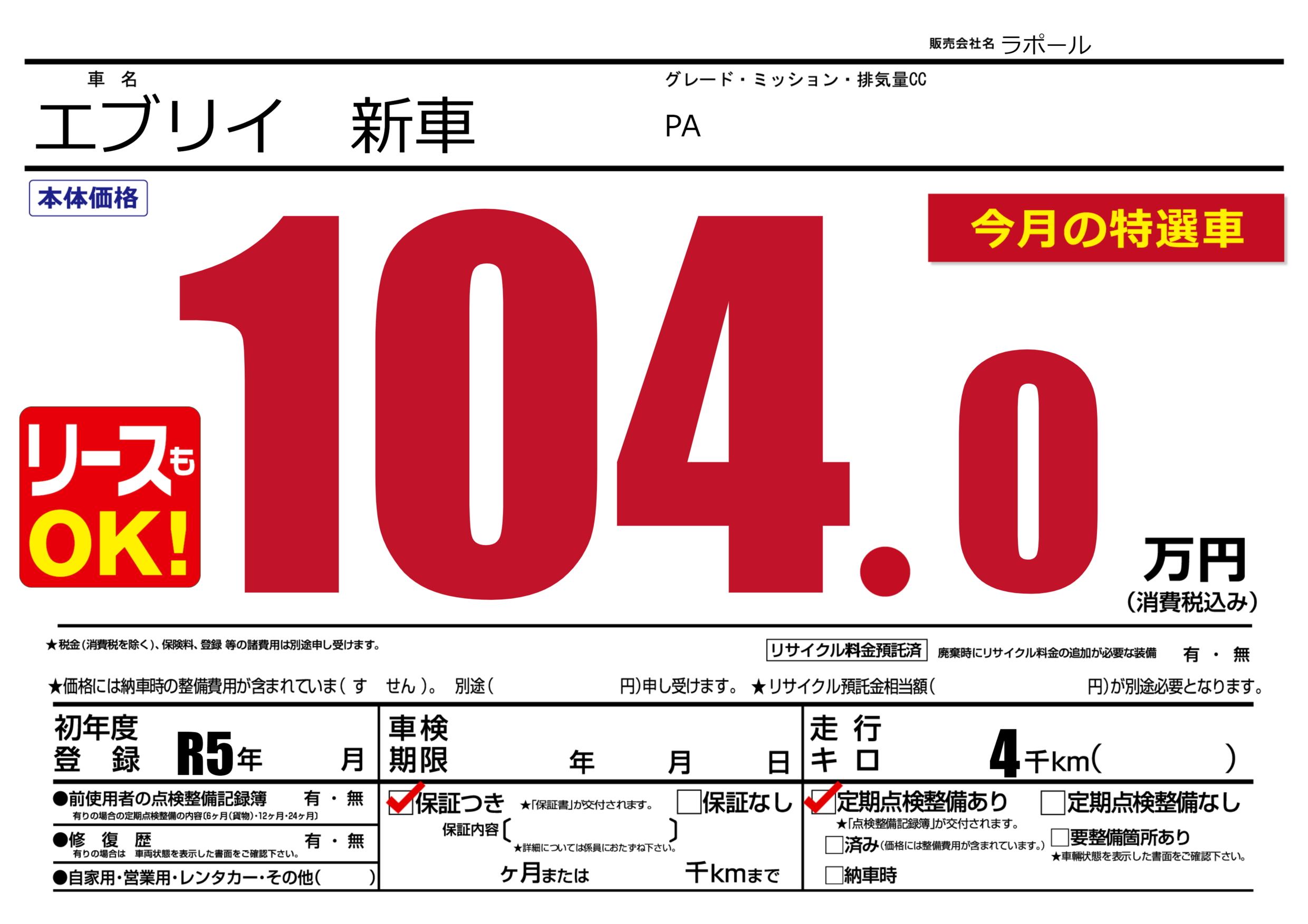 | 車名 | エブリイ 新車 | グレード ミッション 排気量 |