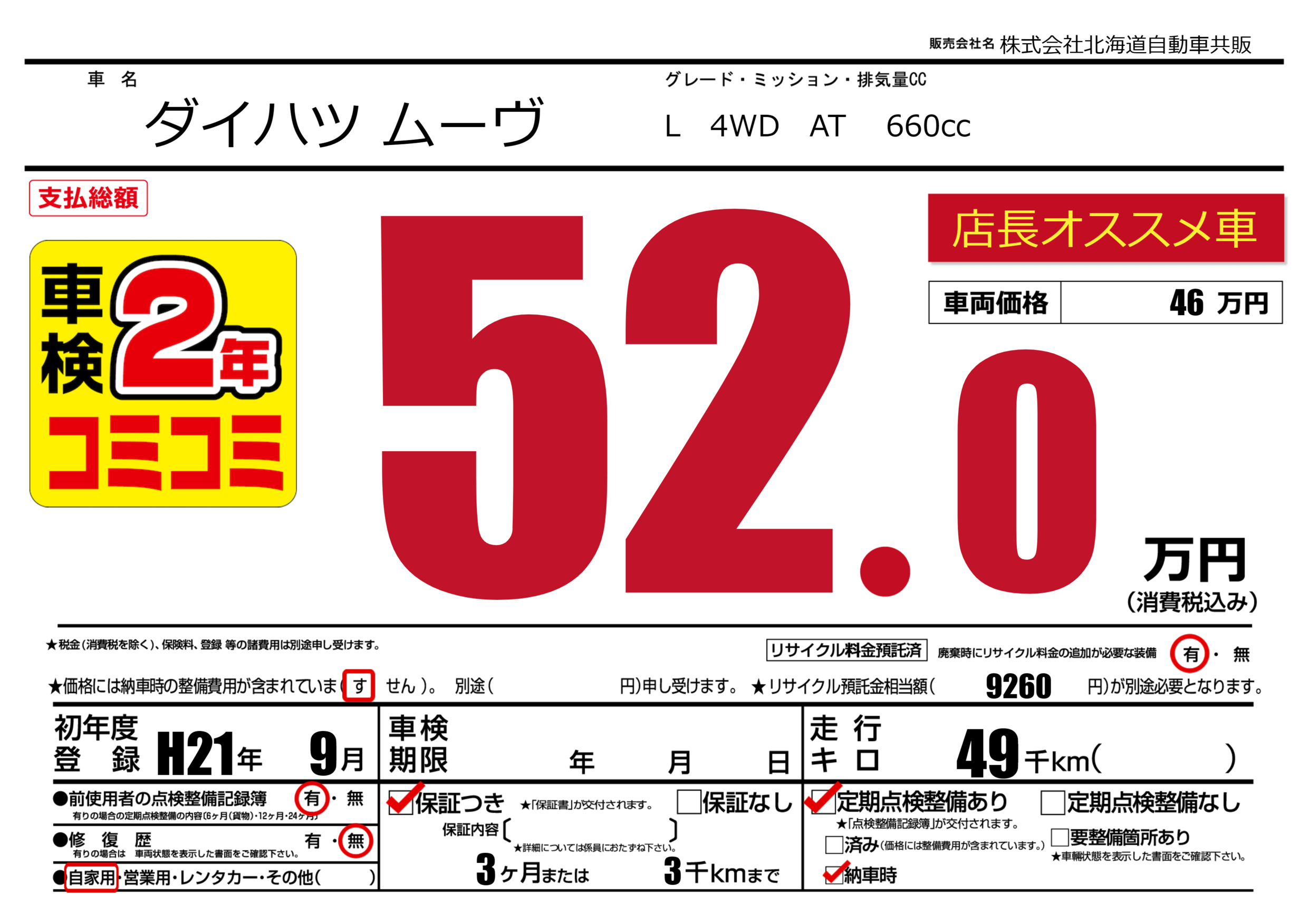 | 走行キロ | 4.9万km | 初年度登録 | H21年9月 |