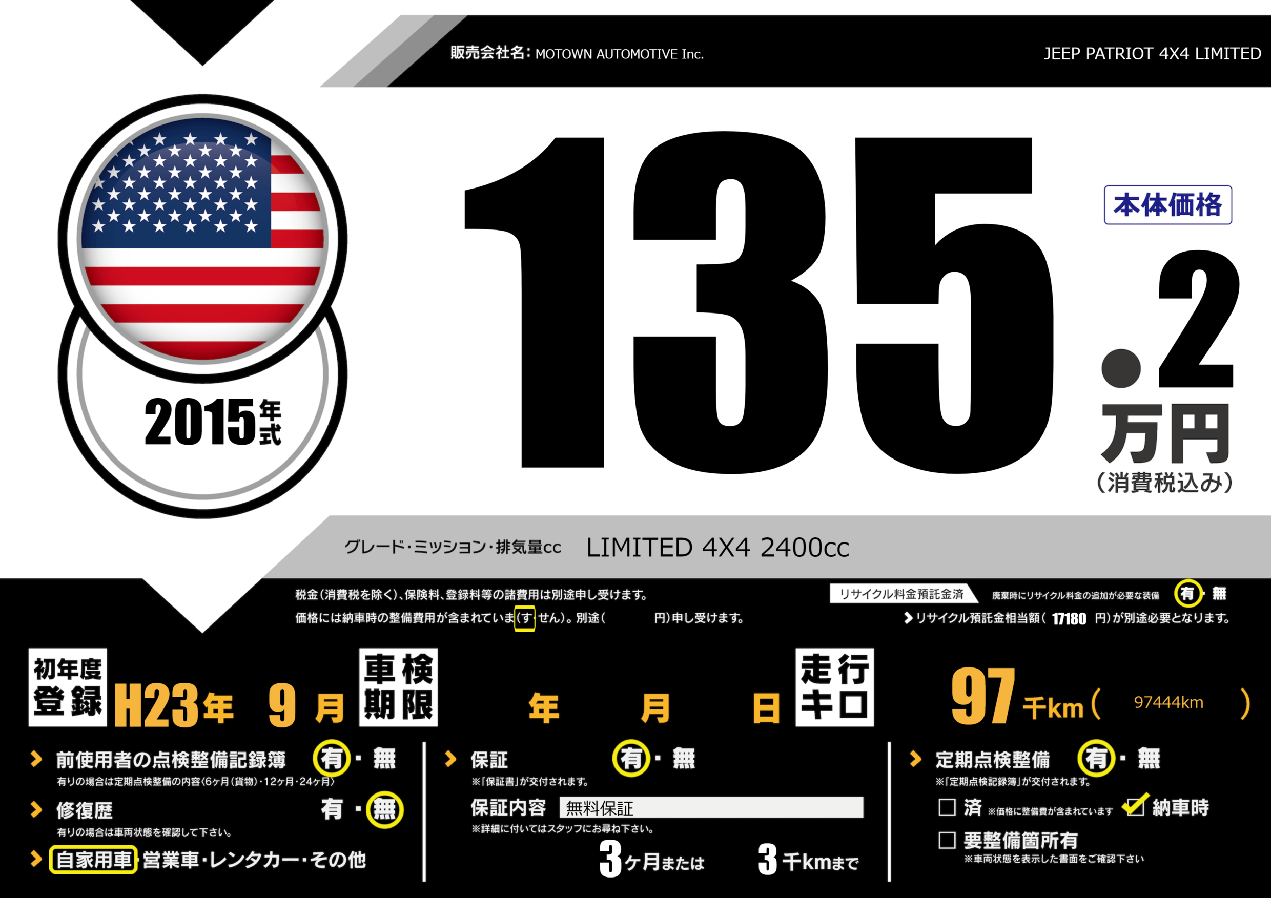 | 車名 | JEEP PATRIOT 4X4 LIMITED | グレード ミッション 排気量 |