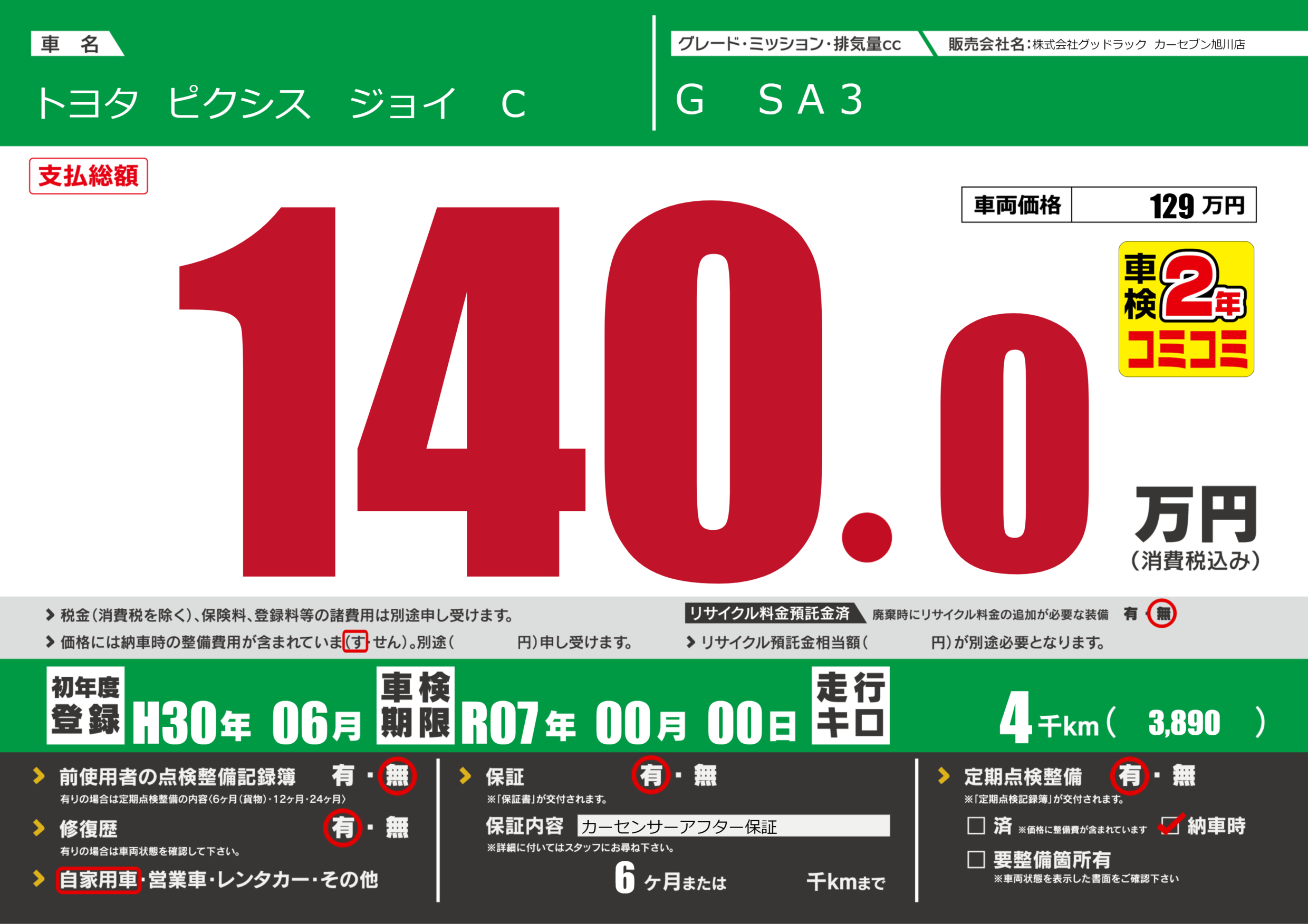 | 車名 | トヨタ ピクシス ジョイ C | グレード ミッション 排気量 |