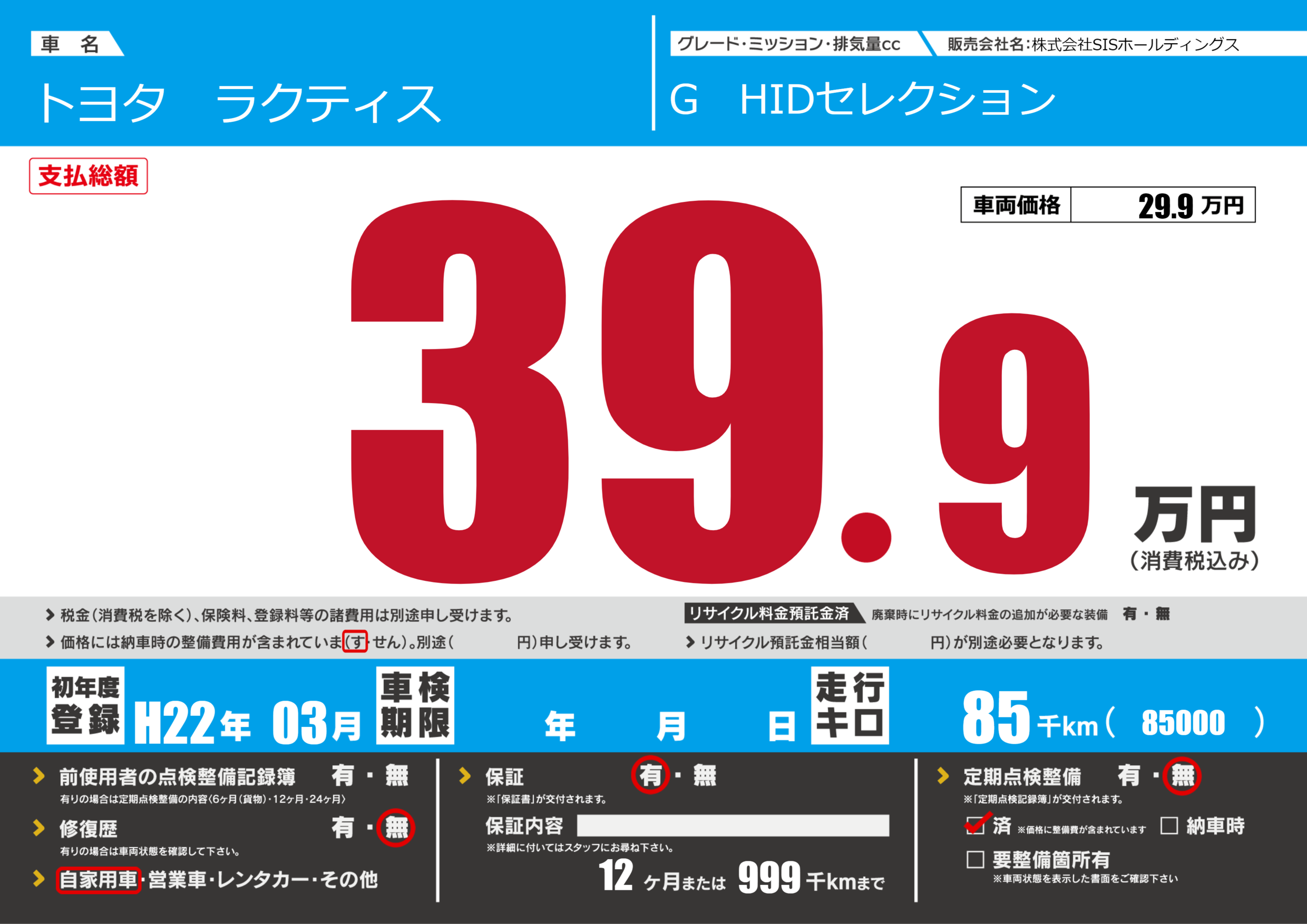 | 定期点検整備 | 定期点検整備なし 定期点検整備済み | ||