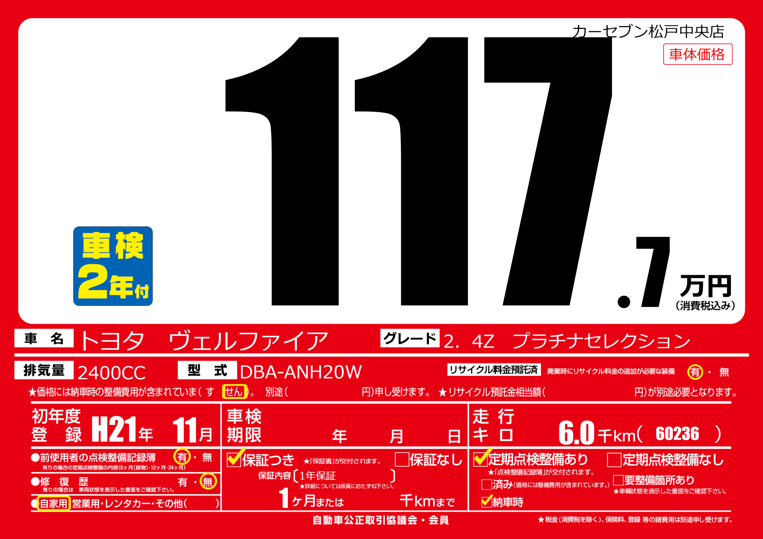 | 車名 | トヨタ ヴェルファイア | グレード ミッション 排気量 |