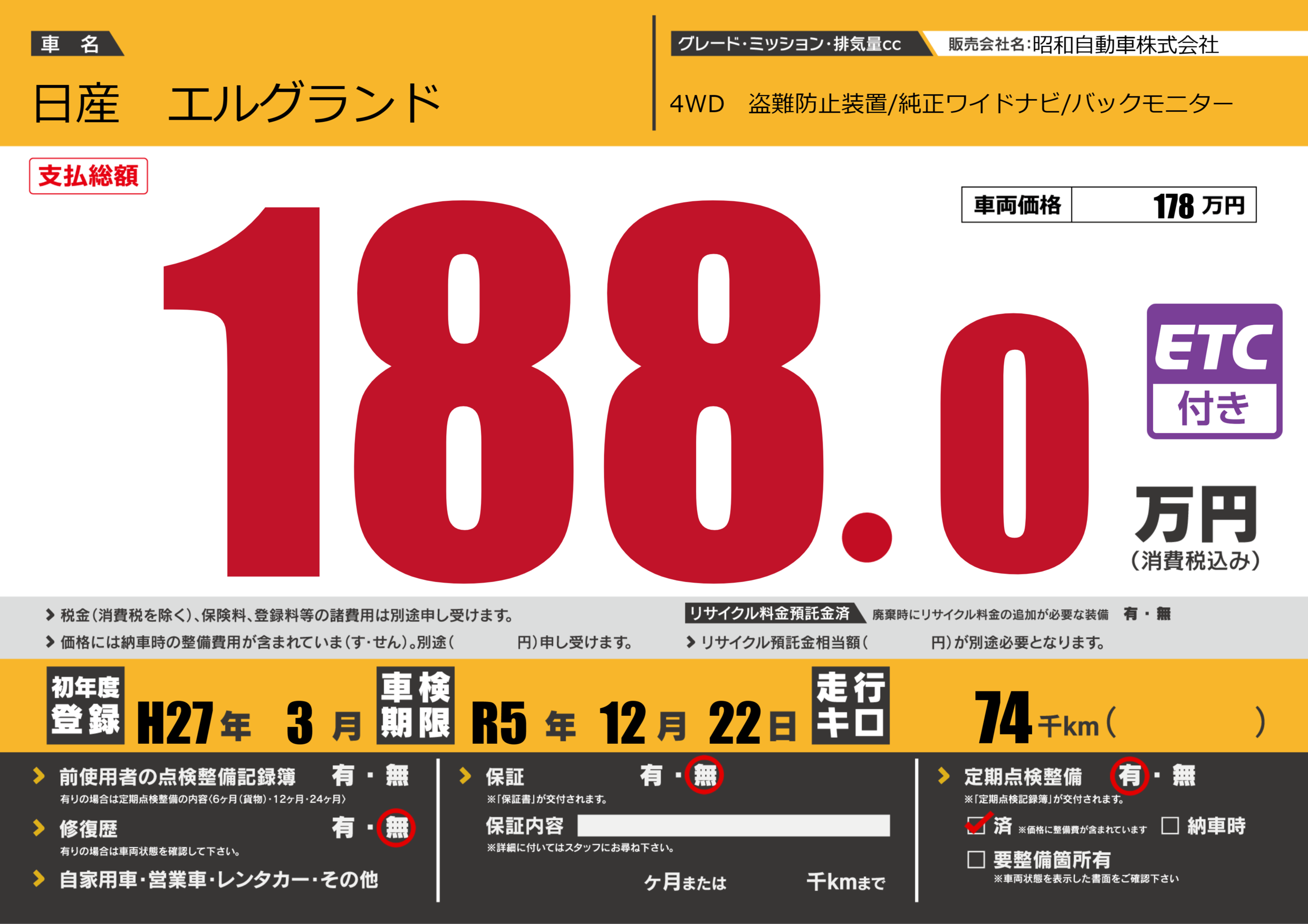| 定期点検整備 | 定期点検整備あり 定期点検整備済み | ||