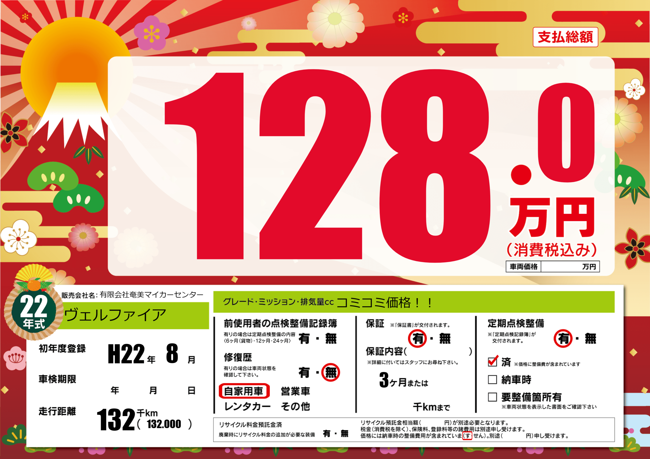 | 走行キロ | 13.2万km | 初年度登録 | H22年8月 |