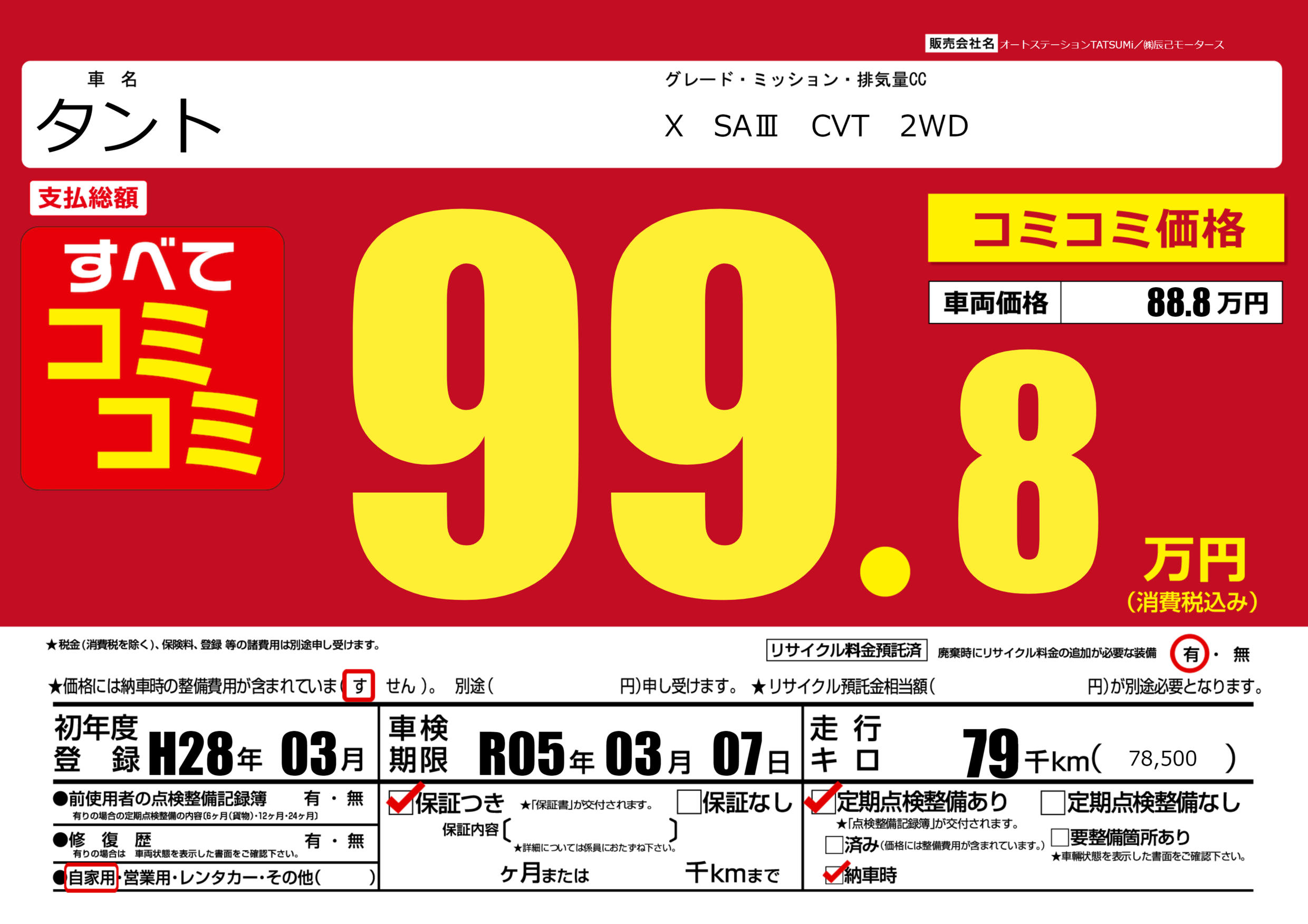 | 車名 | タント | グレード ミッション 排気量 |