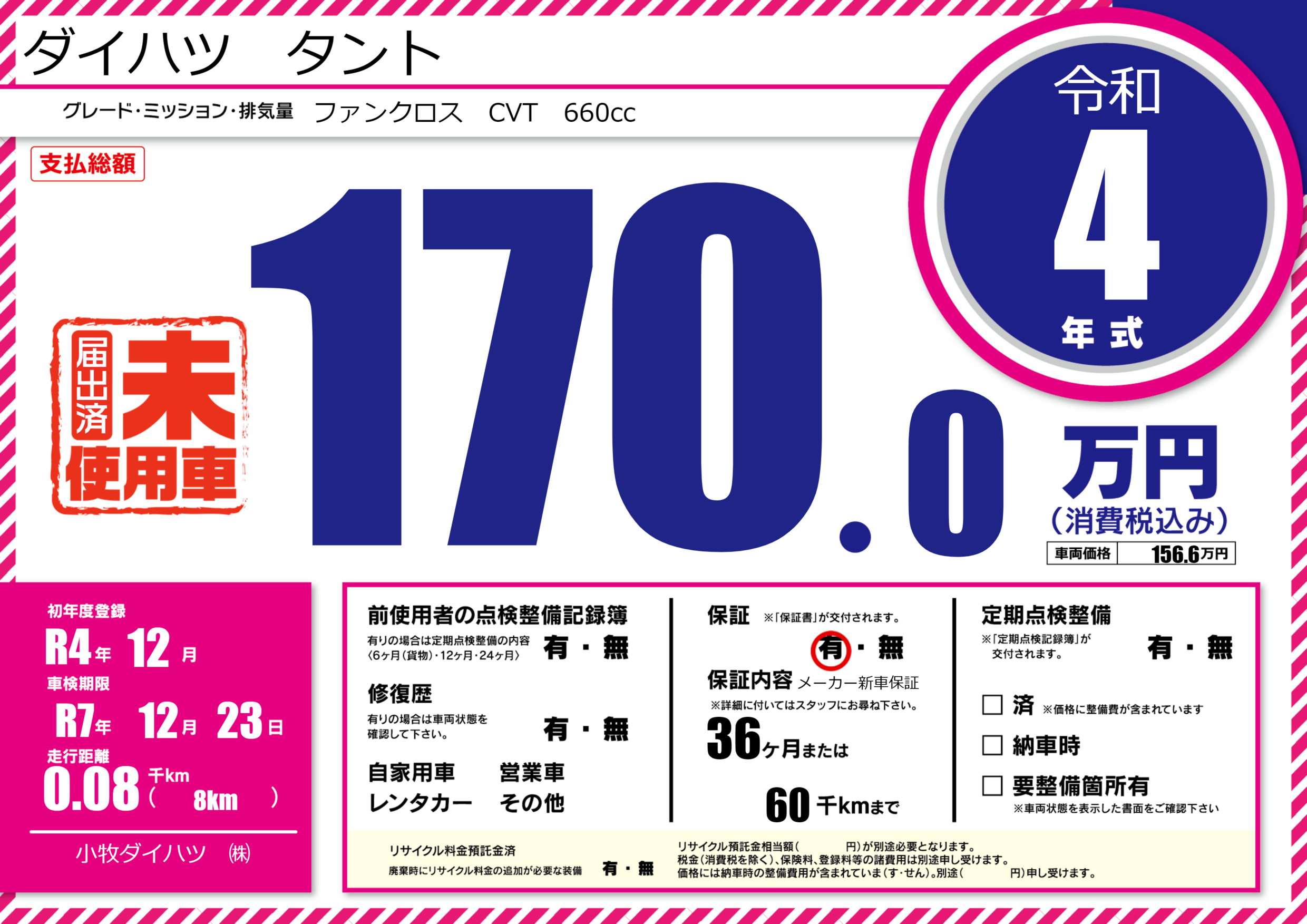 保証付き 保証内容(メーカー新車保証) 36ヶ月または(60)千kmまで |