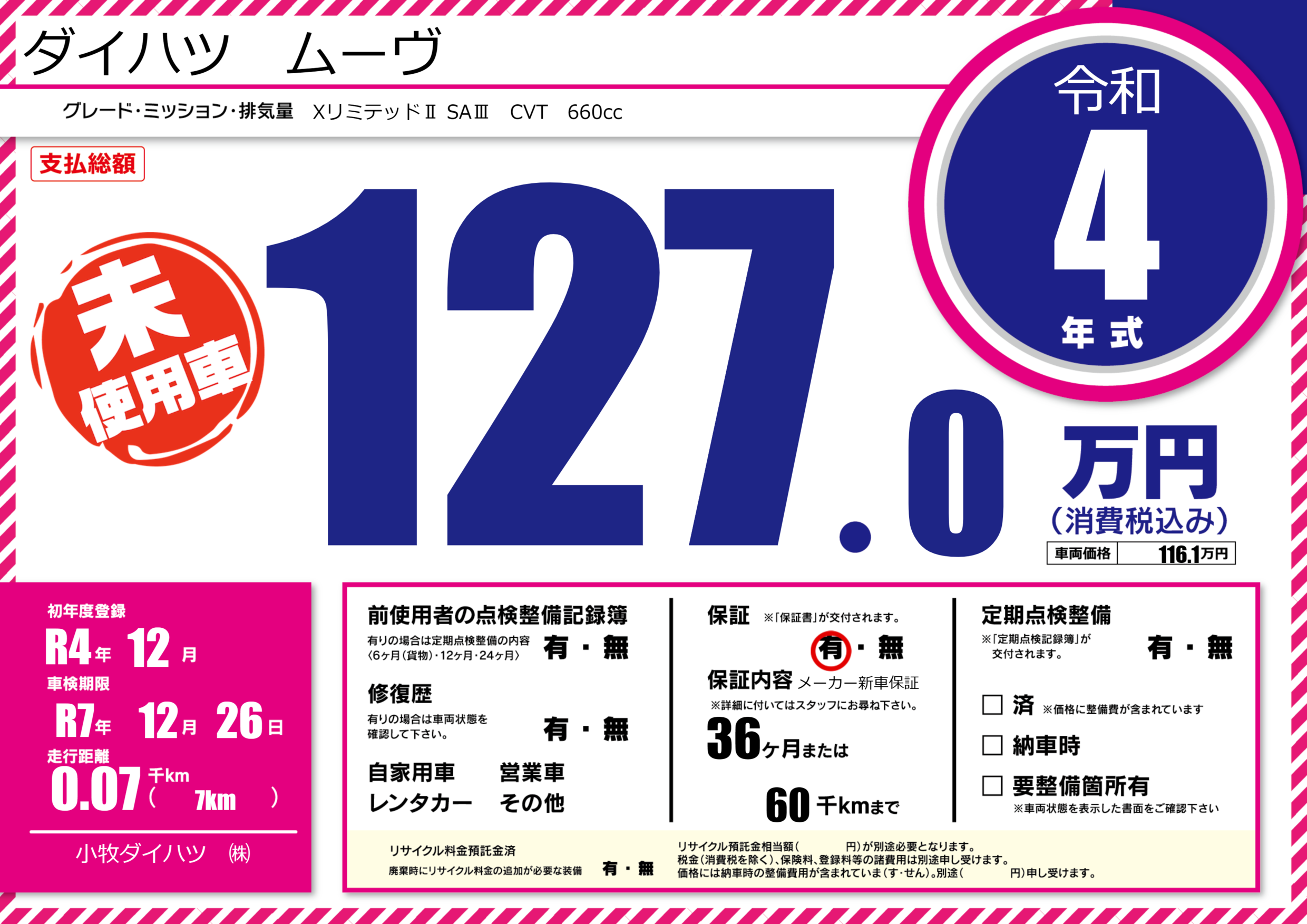 保証付き 保証内容(メーカー新車保証) 36ヶ月または(60)千kmまで |