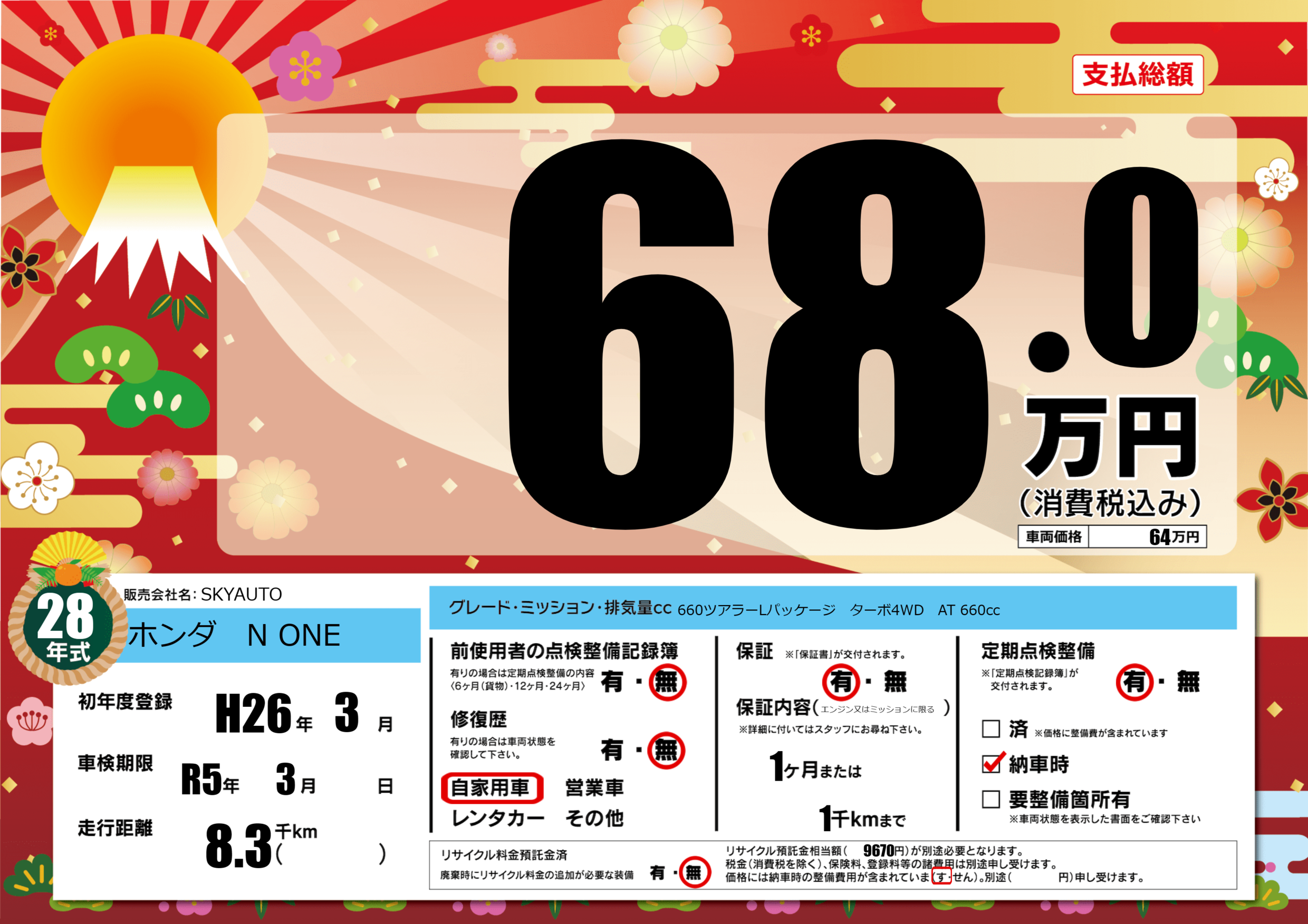 | 車名 | ホンダ N ONE | グレード ミッション 排気量 |