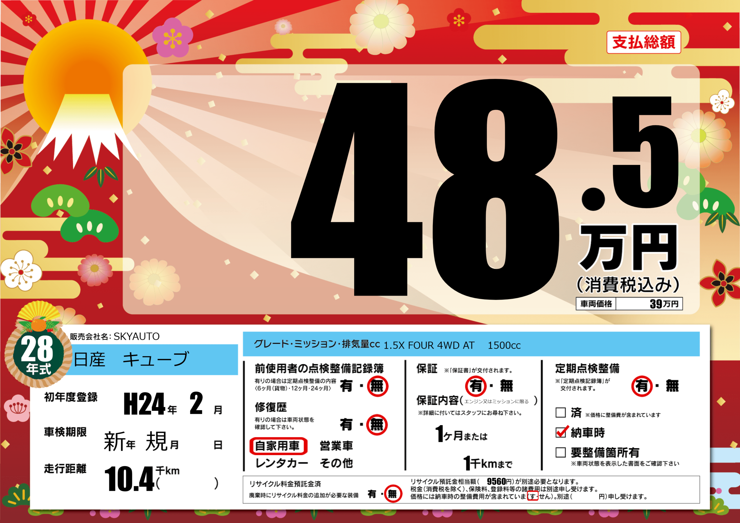 | 車名 | 日産 キューブ | グレード ミッション 排気量 |